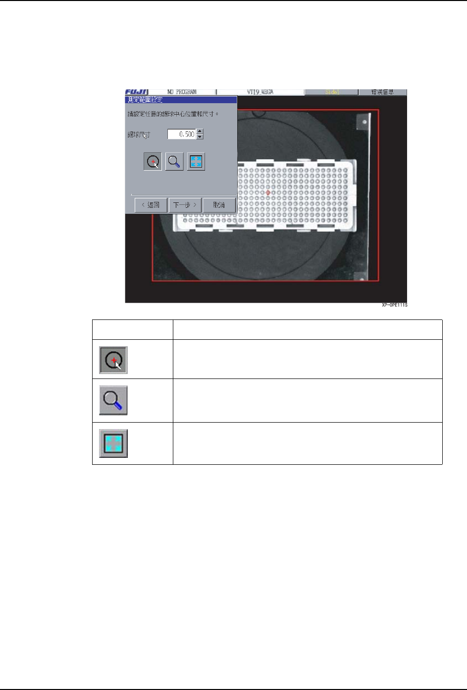5.MDW/PDW SYS-XP143-1.0S 294 XP-142E/143E 系统手册 (仅仅在用 Vision Type19 的 [ 设定元件形状 ] 选择 [ 要素在元件的内侧 ] 的白色主体时显 示) 16.显示出 [ 设 定测定范围 ] 对 话框。 元件主体颜色是白色时,为了取 得元件主体的亮度设定测定位置和锡 球直径。 17.按下 [ 下一 步 ] 按键后,移 动到 [BodyGain 设定 ]。 锡球尺寸 指定测定位置…