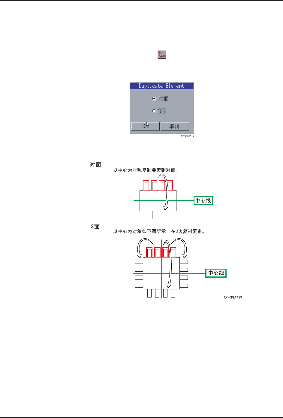 5.MDW/PDW SYS-XP143-1.0S 312 XP-142E/143E 系统手册 作成要素的复制 1. 选择要复制的要素数据。 2. 按下下图。进入复制模式。 显示出 [Duplicate Element ] 对话 框。 3. 将要复制的 Side 从 「对面」 、 「3 面」中选择。