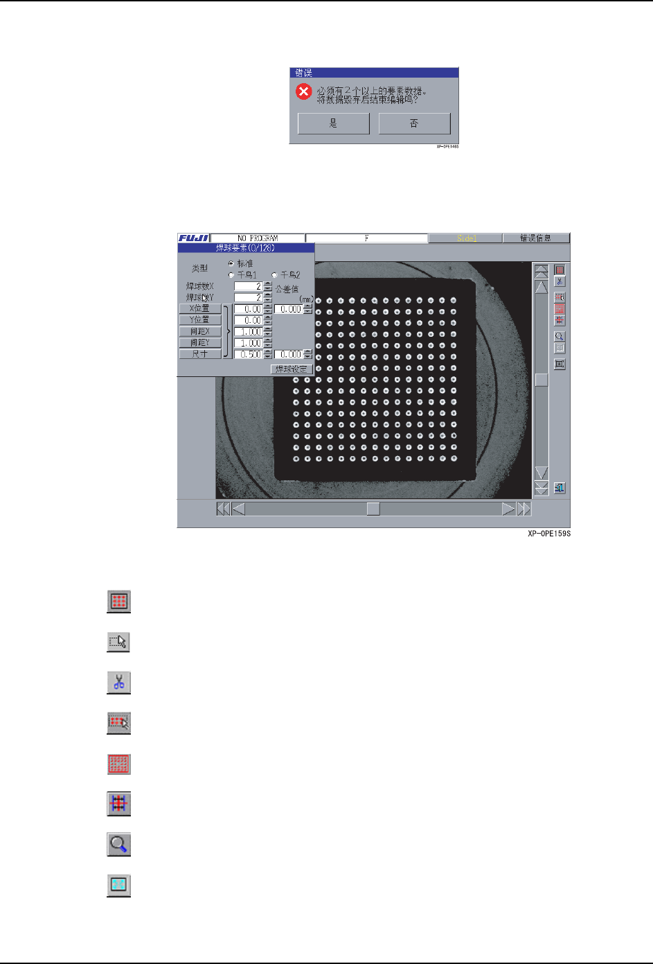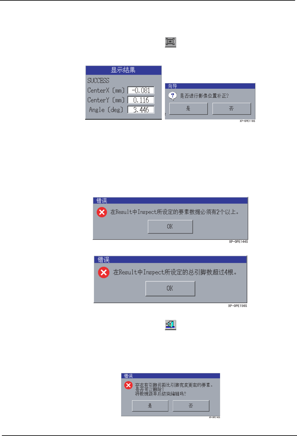 SYS-XP143-1.0S 5.MDW/PDW XP-142E/143E 系统手册 335 影像处理 1. 按下下图,进行影像位置补正。 使用作成的要素进行影像识别, 显示出是否进行中心点补正的询问信 息。 。 2. 按下下图,进行数据检查。 OK 时从编辑画面进入到下一个向导。 当有引脚宽度比间距大的要素时 ,不能保存编辑的要素数据。请废弃 数据结束编辑或者修 正要素数据。 此时出现以下的警告信息。 选择 「是」时,补正影像中心。 …