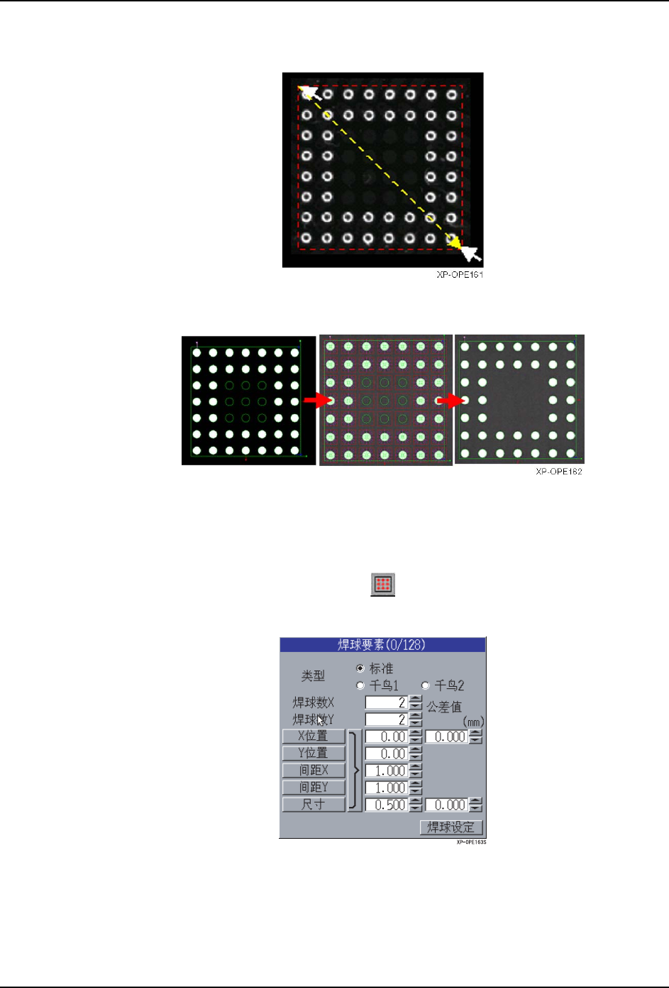 5.MDW/PDW SYS-XP143-1.0S 338 XP-142E/143E 系统手册 3. 在元件影像的引脚上用鼠标斜向拖动。 4. 在作成的矩形内用拖动识别引脚,自动生成要素 。 5. 有必要时再次进行卡尺测定,进行元件影像的位 置或者倾斜度的补正。 由要素手柄进行手工输入 1. 按下下图,进入锡球要素模式。显示出 [ 锡球要素 ] 对话框。 锡球要素最大可以注册 128 个。注册数显示在对话框的标题 部分。 ·种类: 指定要…