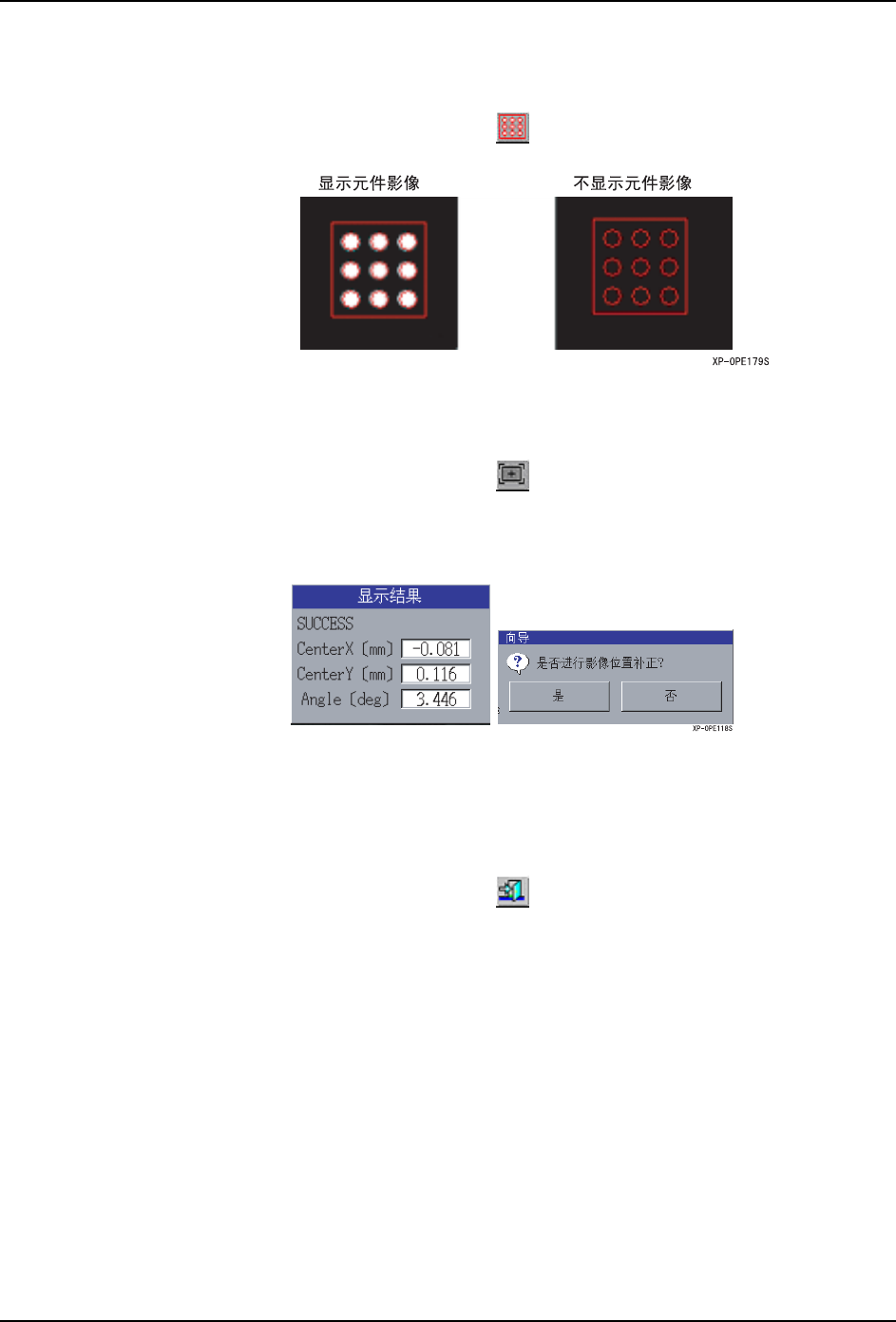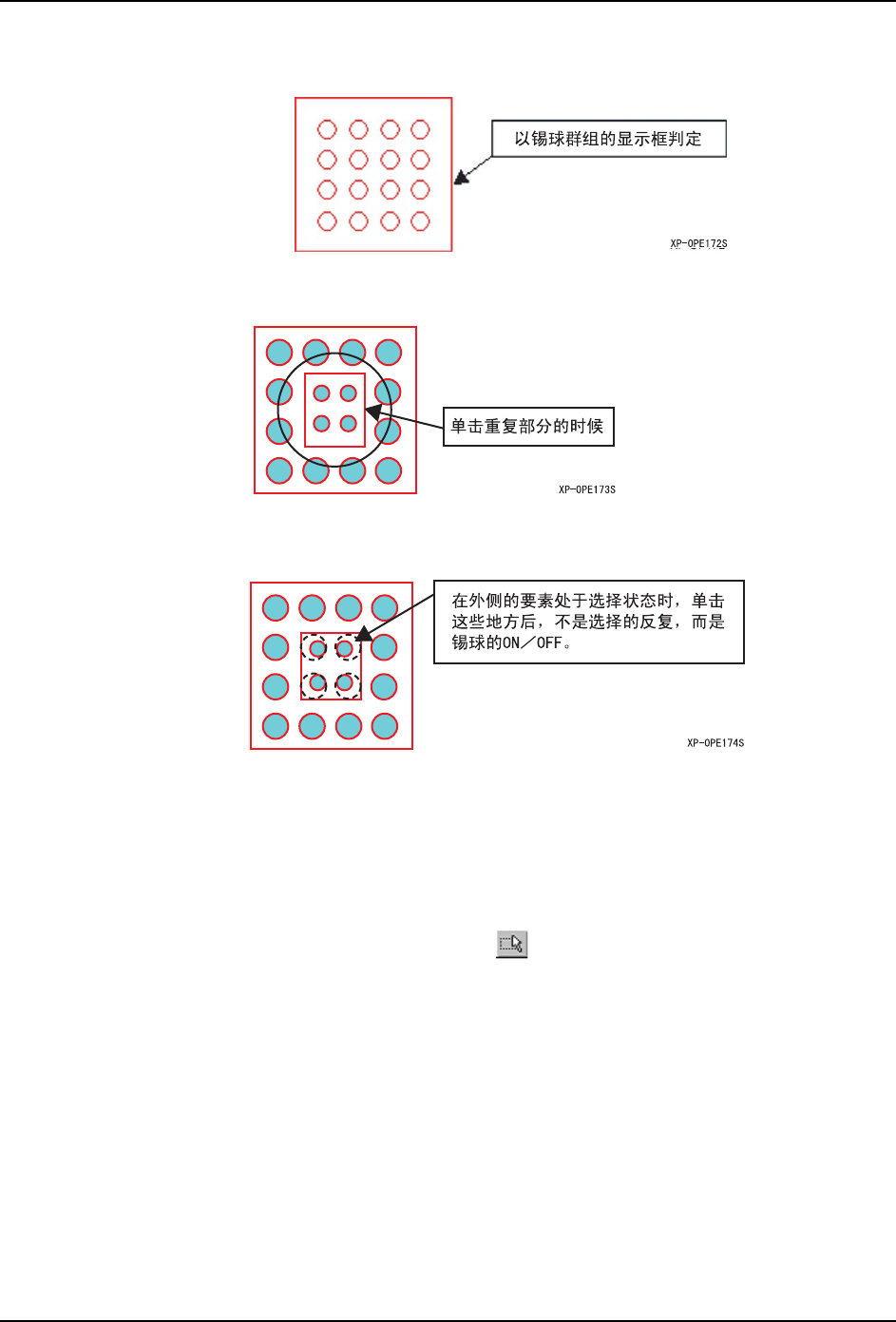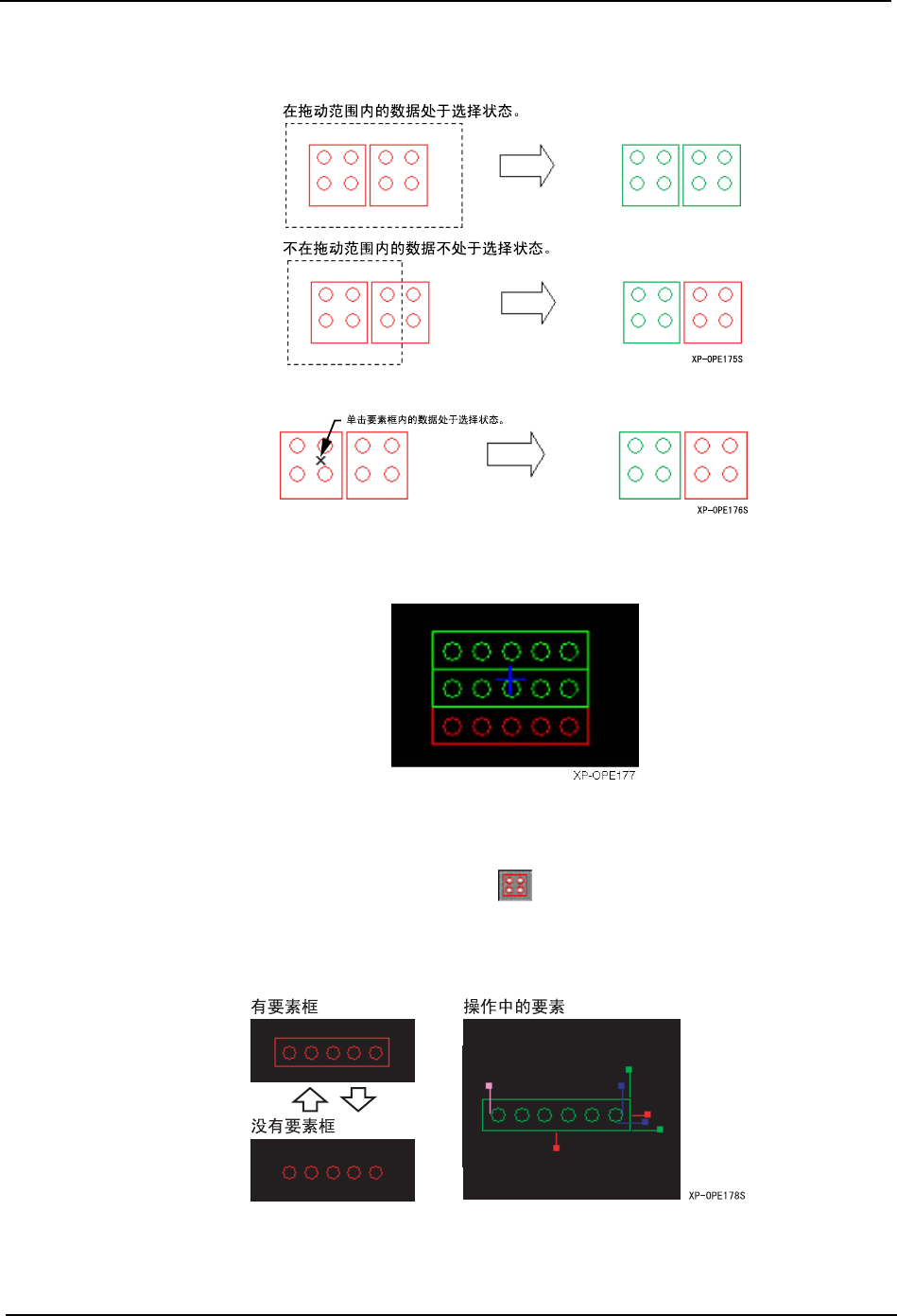 SYS-XP143-1.0S 5.MDW/PDW XP-142E/143E 系统手册 343 2. 将编辑的要素用鼠标的拖动操作或者单击进行选 择。 备注 ) 在此模式上不显示移动用的手柄。请在选择状态下拖动或者在 [ 锡球要素 ] 对话框的 [X 位 置,Y 位置 ] 中输入数据。选择要素的画面显示在绿色的框和中心以十字线显示。 要素框的显示 / 非显示 按下下图,切换要素框的显示。 当前操作中的要素以现状用操作 手柄和附加框显示。