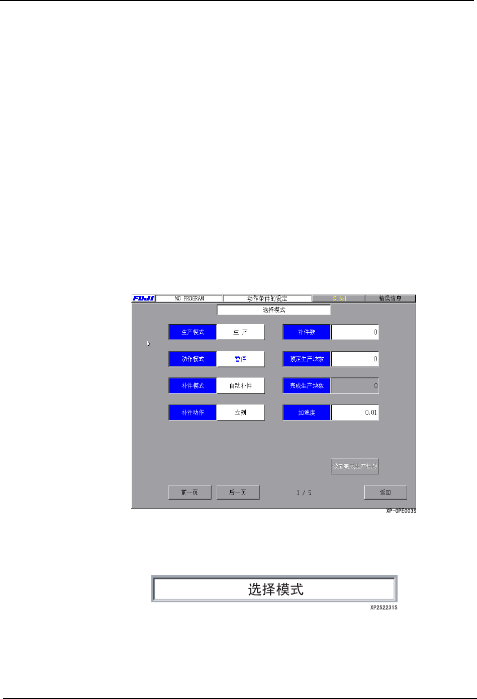 3. 操作系统 SYS-XP143-1.0S 26 XP-142E/143E 系统手册 2. 以当前打开页数 / 最大页数来显示。 3. 单击按键后,返回 [ 主画面 ]。 4. 按下 [ 前一页 ] 按键后,前翻 1 页。当前打开页为 1 时,移至最大页。按下 [ 后一页 ] 键时,后翻 1 页。当前打开页为最大页时,移至第 1 页。 模式选择 在设定机器的动作模式的画面上 ,设定步骤如下所示。 生产模式 机器有 4 种生产模式: “…