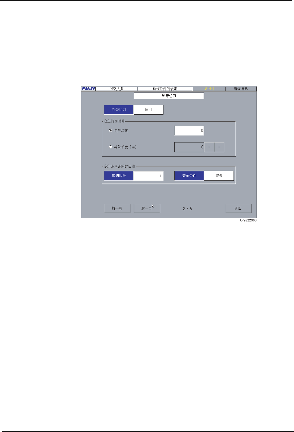 2. 按下 [ 后一页 ] 按键,显示出 [ 料带切刀 ] 页。