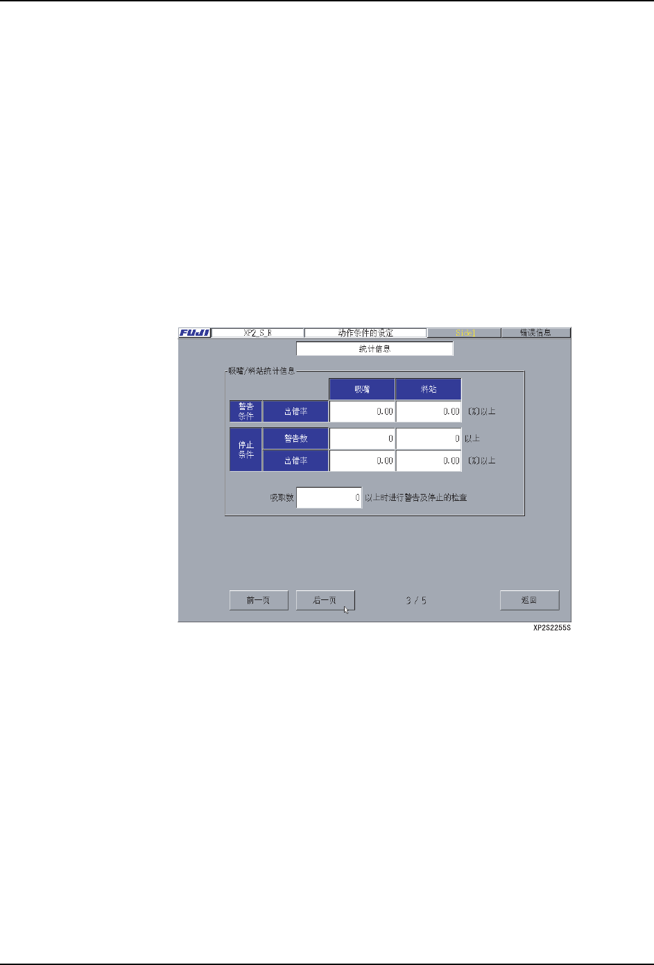 4. 在吸嘴和料站上的吸取错误达到设定值时用警告条件区域设定警告的错误率。( 输入范