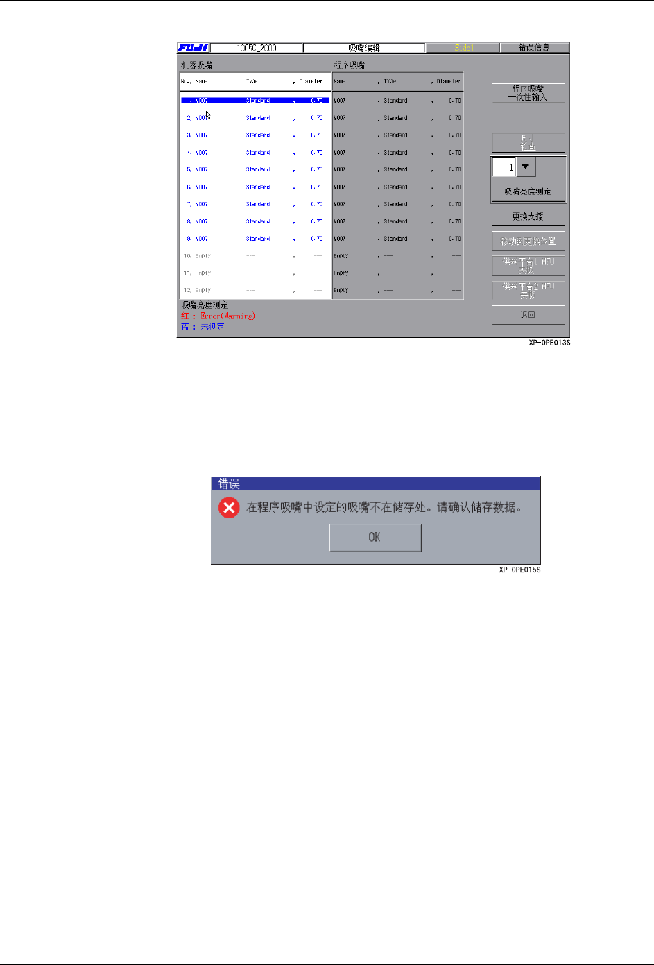 3. 显示出以下的错误信息时,请在 「吸嘴存储编辑」画面上确认吸嘴的有无。必要的吸嘴