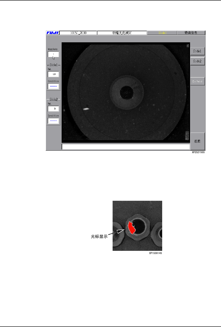 3. 操作系统 SYS-XP143-1.0S 60 XP-142E/143E 系统手册 5. 按下 [ 启动 ] 按键。机器吸取选择的吸嘴开始进行亮 度测定。测定中在画面下方显示出 正在测定的信息。 6. 测定结束后,在画面的左侧显示出测定 Sind 的测定结果。 BML( 黑色标记水准 ) Condition(OK/War ning/Error) 伴随着上述的测定结果,机器吸 嘴一览表的文字的颜色被改写。按下 画面右侧的 [ 光标 显…