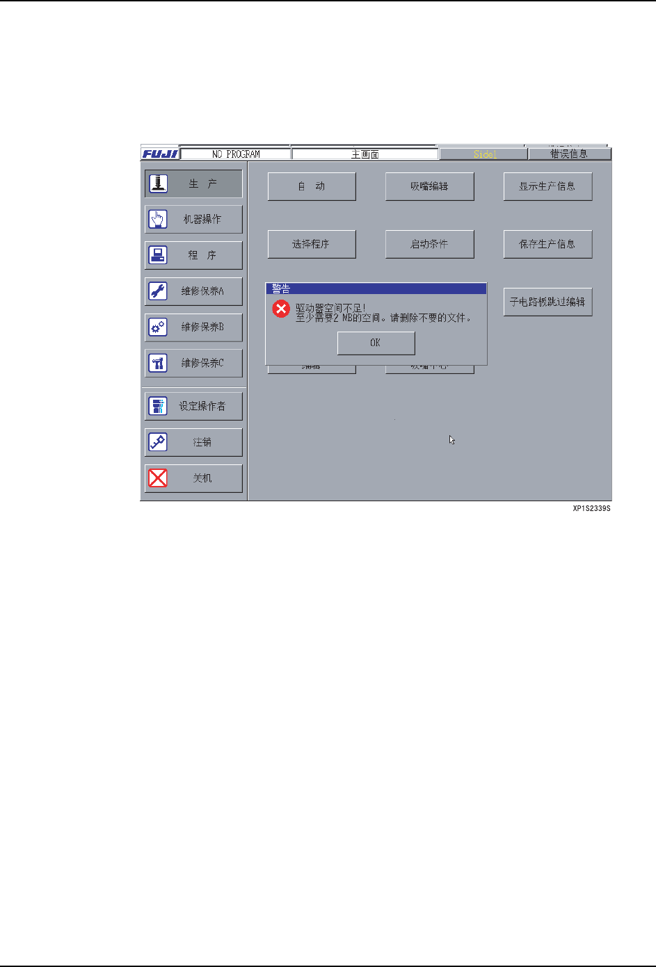 在 [ 主画面 ] 上选择 [ 生产 ]、按下 [ 自动 ] 按键后机器检查硬盘的剩余量。硬盘最低少