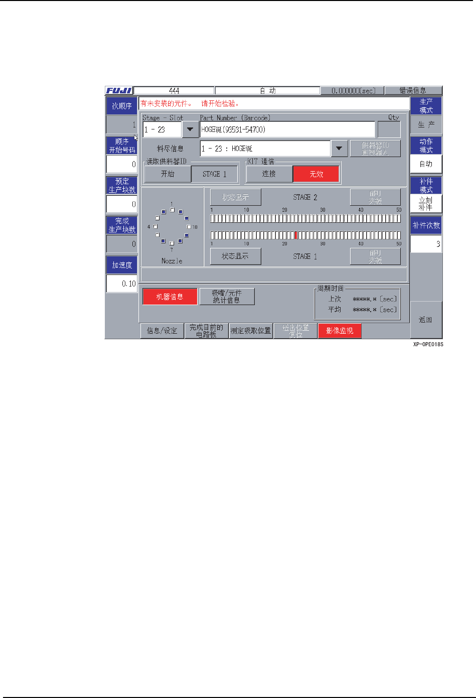 3. 操作系统 SYS-XP143-1.0S 74 XP-142E/143E 系统手册 注意 ) ※印的项目中,只有具有维修保养 A 的权限的操作者,才可以变更参数。 执行供料平台的切换:执行供料 平台切换。 (仅仅在 AA 模式时显示出这个按键。 ) 当前使用中的平台显示在模式的 后方。 (只限于 AA 模式) 料站信息 : 显示出生产程序中设 定的平台、料槽信息。 料尽信息 : 显示出机器判断为 「料尽」的料槽。按 下 [ 元件设定…