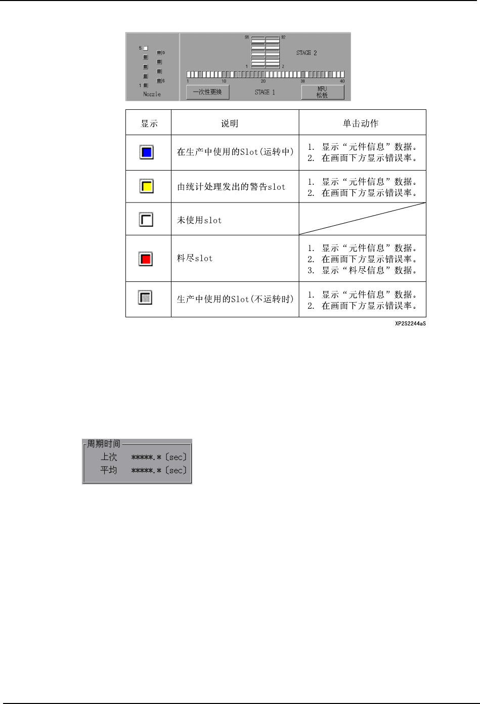 SYS-XP143-1.0S 3. 操作系统 XP-142E/143E 系统手册 75 完成目前的电路板 生产中的 ( 在主搬运轨道上 ) 电路板的生产结束后,在进入排出搬 运轨道时可以使机器自 动停止。 操作步骤 元件一次性设定结束: 选择此按键,使平台上所有料站进入 元件安装状态。 MFU 松板: 松开 MFU。 机器信息: 显示机器信息画面 ( 自动生产初始画面 )。 吸嘴 / 料站统计信息: 显示吸嘴 / 料站统计信息画面。 周…