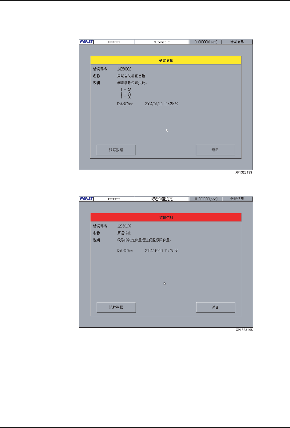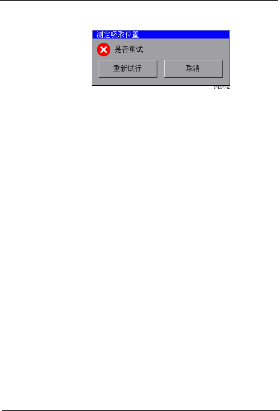 SYS-XP143-1.0S 3. 操作系统 XP-142E/143E 系统手册 87 5. 按下错误画面的 [ 返回 ] 按键时,显示出是否进行重新 测定的确认对话框。 [ 重新试行 ] 按键 : 将测定结果复位后重新进行 测定。 [ 取消 ] 按键 : 结束测定 (此时不进行失败的料站的吸取位置补正) 。
