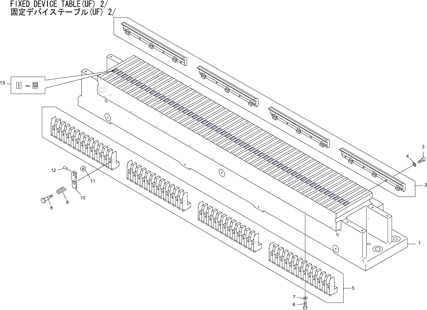 FIXED DEVICE TABLE(UF) 2/ 固定デバイステーブル(UF) 2/ No. Drg.No. & Code No. QTY Description Rating Materials Remarks 番号 図番 & コード番号 個数 品名 規格 材質 備考 1 DNUF2003 1 BASE ベース FE 2 DEUF1401 1 CLAMPER クランパ FE 3 H5321A 12 BOLT, HE…