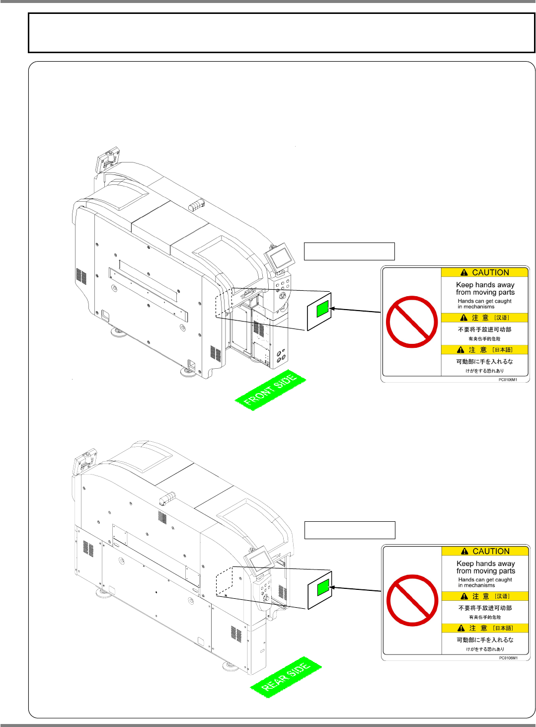 NPM-D 安全注意事项 EJM1DC-SF-02N-00 Page S-21 产品上的安全标牌 注意标牌 如下图所示,本机器贴有警告显示标 牌。请遵守标牌的指示。 标牌脱落时,请参照 Parts List ( 元件一览表 ) 的标牌型号,向本公司订购并 将其重新粘贴到正确的位置 。 前侧警告显示标牌粘贴位置 后侧警告显示标牌粘贴位置 3D 传感器前面 3D 传感器前面