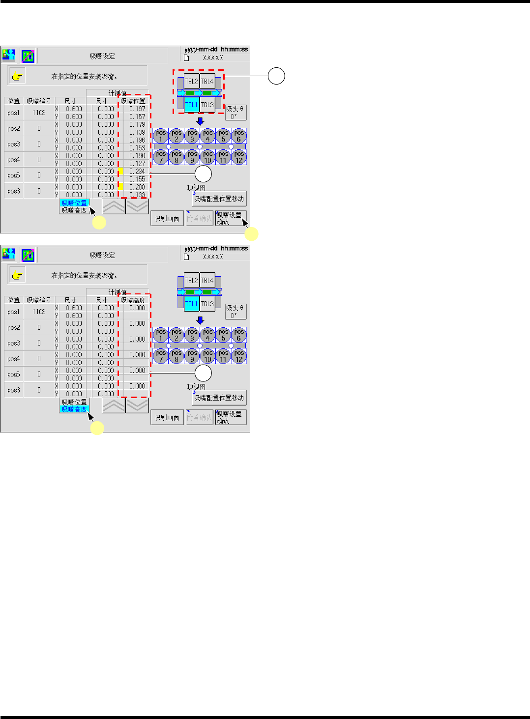 CM602-L 参考手册 2.2 生产设定 Pa ge 2-11 有吸嘴交换器、没 有部品厚度传感器 (12 吸嘴用选购件 ) 时 除了各吸头上的吸嘴外 ,还显示设置在吸嘴 交换器上的吸嘴名称 ,并能够进行吸嘴 的更换动作。 ∗ 请选择要确认的吸头的 工作台 。 ∗ 关于吸嘴交换方法,请 参照 操作手册 “5. 生产基板的变更 ” 。 a. [ 计测值 ] • 显示 在 [ 吸嘴设置确认 ] 上识别的结果数值 。 b. [ …