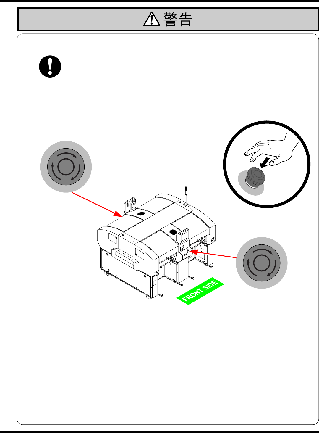 CM602-L 参考手册 14 因进行生产材料的 补给·机种切换·调整等操作而需 要将手或身体的一部进 入机器的可动部内 时,应遵守下述事项 机器会运转,有可能造 成伤害。 另外,也有可能导致触 电。 根据相应的作业内容, 分为下述 3 个阶段。 进行控制 BOX 等的修理时 --------------------------------------------------------- - 停止向本机器供给电源 。 通常…