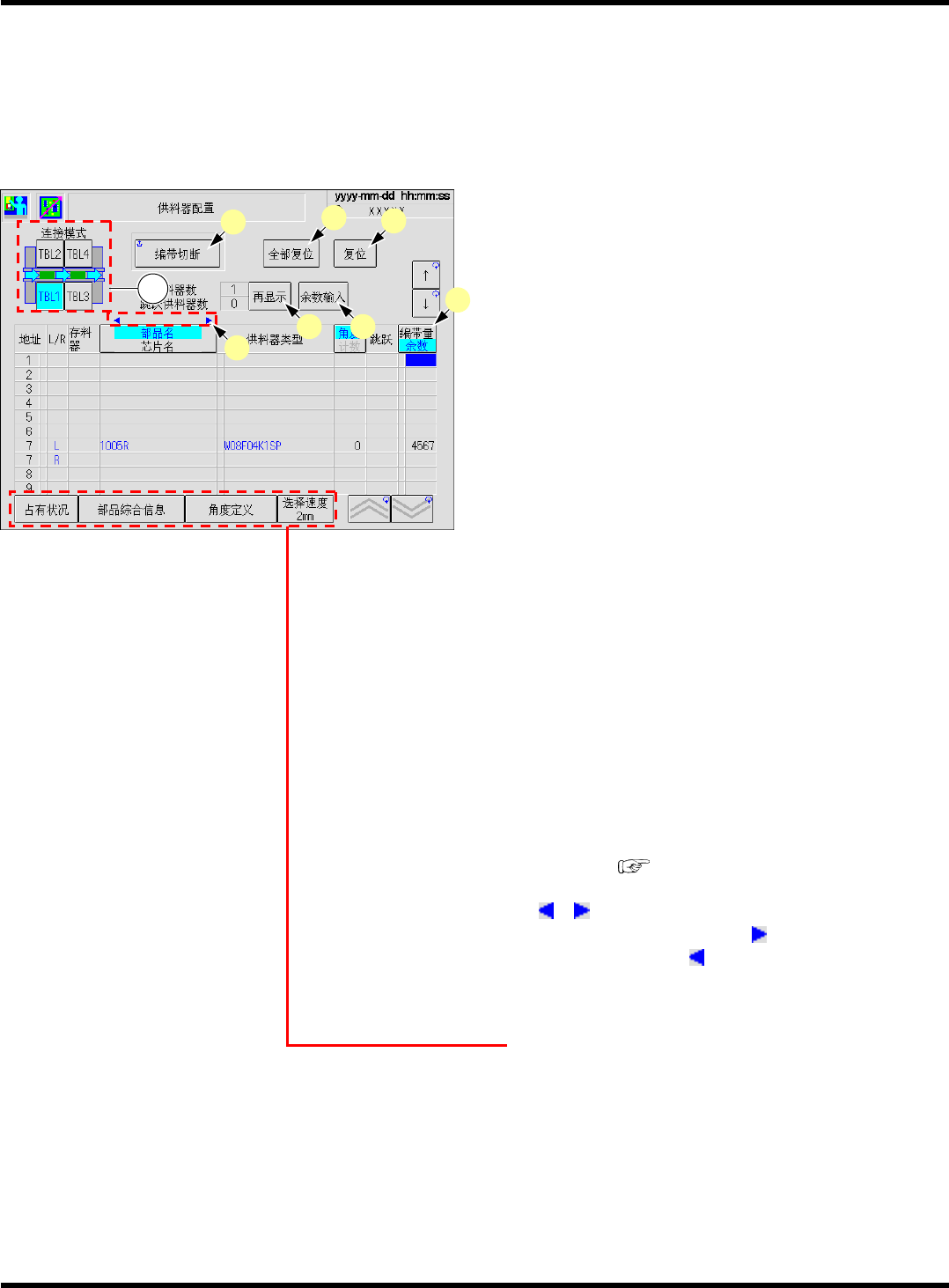 台上的哪一供料器地址在使用中。也显示各卷盘的部品余数和压紧胶带量。