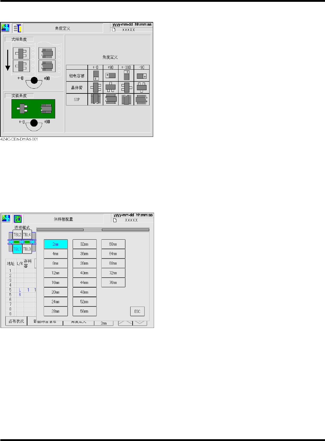 CM602-L 参考手册 2.2 生产设定 Page 2-8 角度定义 [ 角度定义 ] • 按此按钮显示左边画面 。 显示主要部品的吸着、 实装时的角度定义。 选择速度 [ 选择速度 ] • 按下后,如左所示的画 面将被显示。在此选 择 在供料器配置上选择的 芯片的供料器进给间 距。在 [ 选择速度 ] 的下部将显示所选 择的间距。 EJM4A -Pc-0013 EJM8A-C-RMC0 2-A01-00