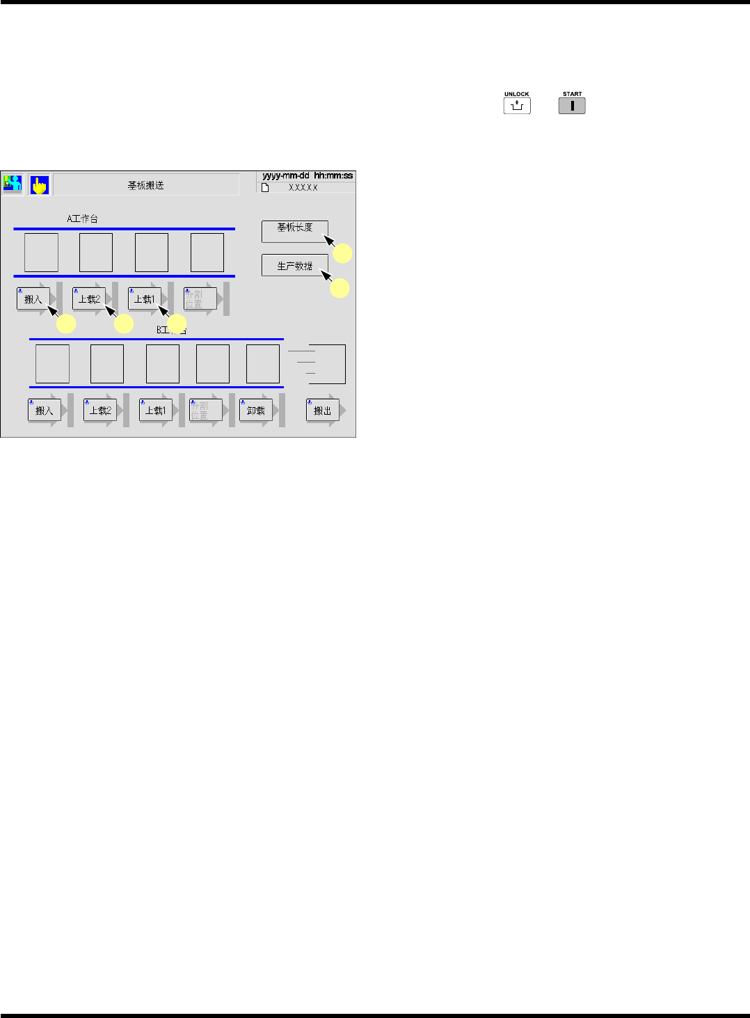 CM602-L 参考手册 2.2 生产设定 Pa ge 2-19 <B 工作台 > f. [ 搬入 ] • 往 B 工作台待机传送带 位置搬入基板。 ∗ 基板长度为 331 ~ 5 10 mm 时, 不能使用 [ 搬入 ] 的贴装位置。 ( 显示的颜色将变为灰色, 就不能选择。 ) g. [ 上载 2] • 往第 2 贴装位置搬送基板 。 ∗ 基板长度为 241 ~ 33 0 mm 时,不能使用 [ 上载 2] 的贴装位置。…
