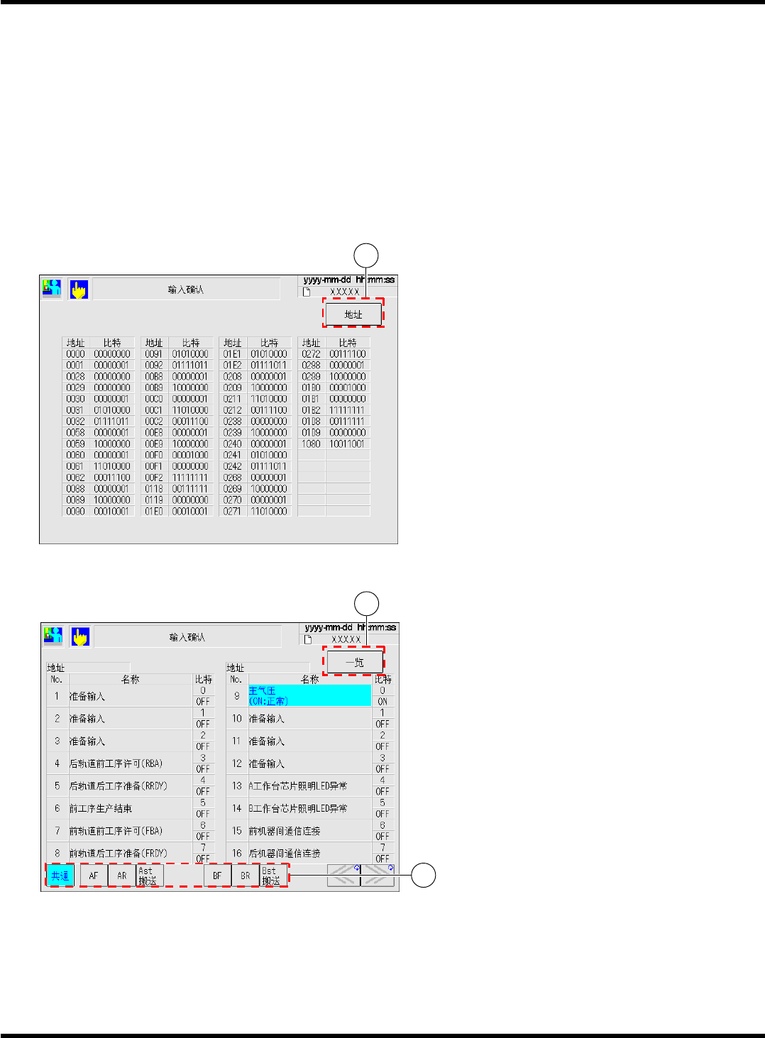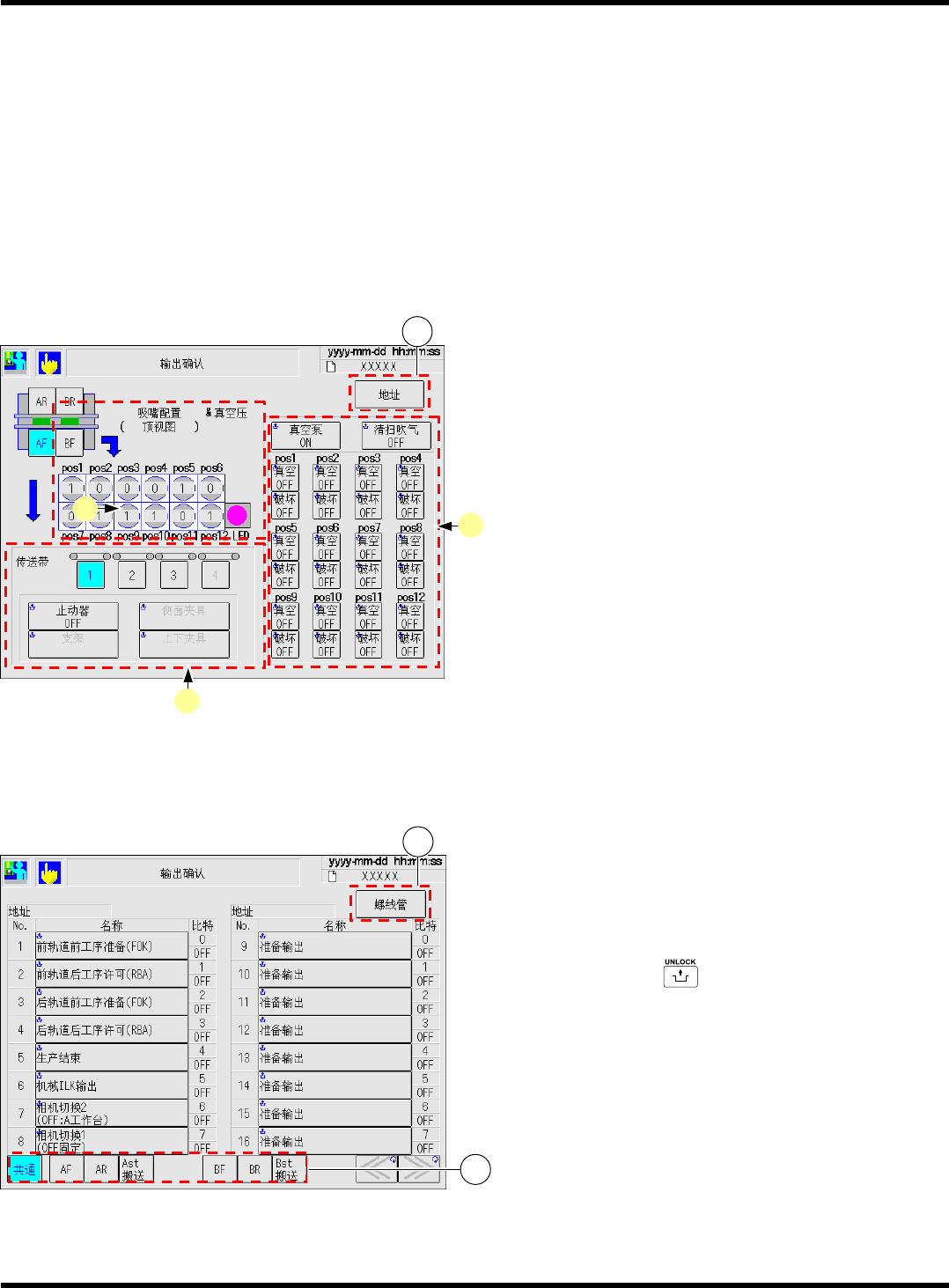 CM602-L 参考手册 2.4 机器调整 Pa ge 2-42 2.4.8 输出确认 可以以工作台为单位, 确认调整时频繁使用 的阀的状态,并且使 之各自单独动作。 ∗ 每按一次画面右上的按 钮 ,信息显示在电磁阀显 示和地址显示之间切 换。按钮内的显示也 将会 切换。 1. 在机器调整的菜单画面上按 [ 输出确认 ] 。 • 输出确认的画面将被显 示。 • 画面项目内容如下所示 。 电磁阀显示 • 画面为高速吸头 (12 吸…