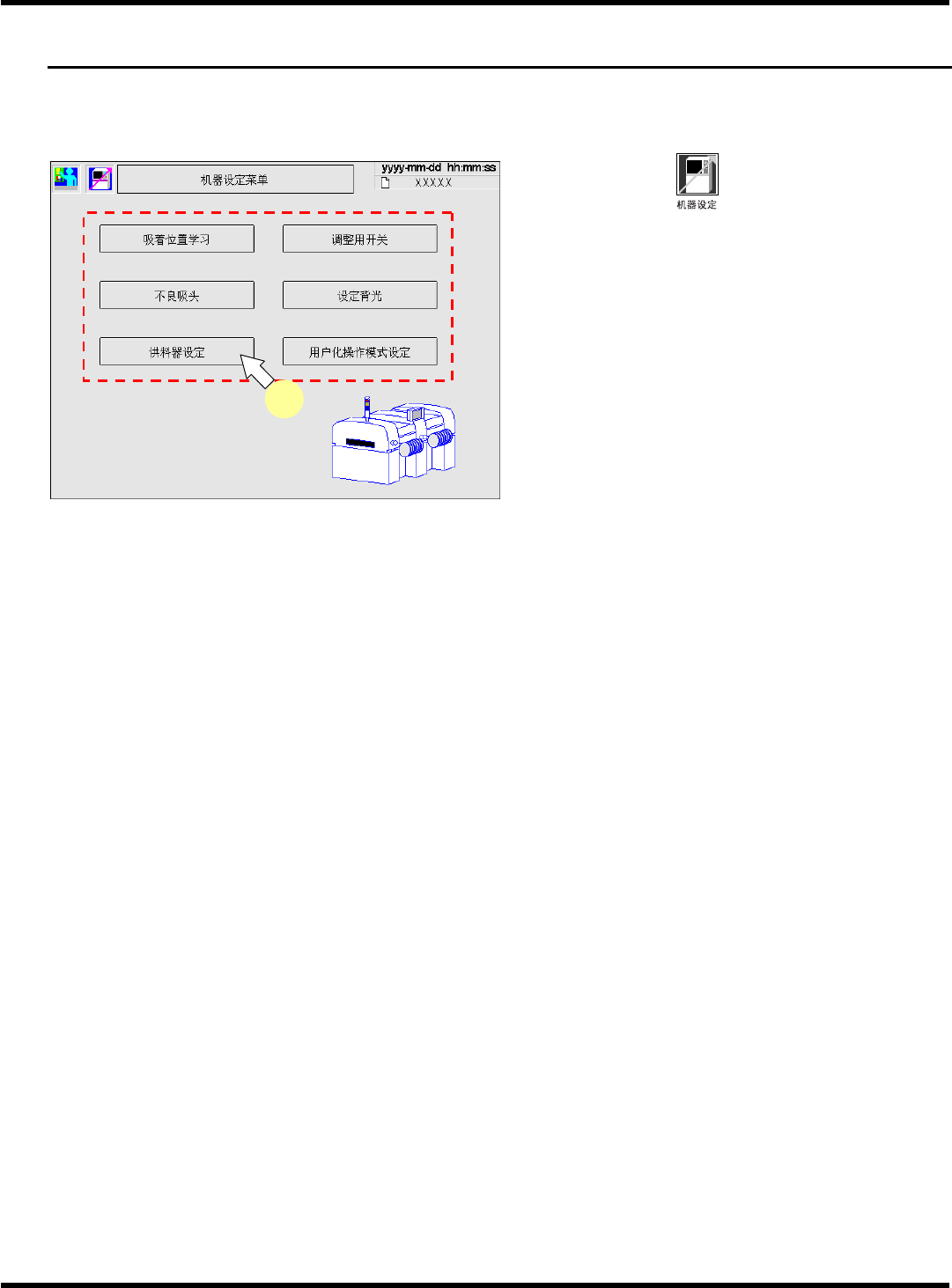 CM602-L 参考手册 2.5 机器设定 Pa ge 2-47 2.5 机器设定 可以进行不依靠生产数 据的机器状态的设定 。 ∗ 不能从操作员模式的主 菜单 ( 初始设定状态 ) 进入。 1. 按主菜单的 。 • 机器设定菜单的画面将 被显示。 2. 按虚线框内的任何功能按钮。 ∗ 关于各功能,请参照下 页以后的说明。 EJM8A- C-RMC02-A02- 00 EJM4A -Mc-Menu-0001 2