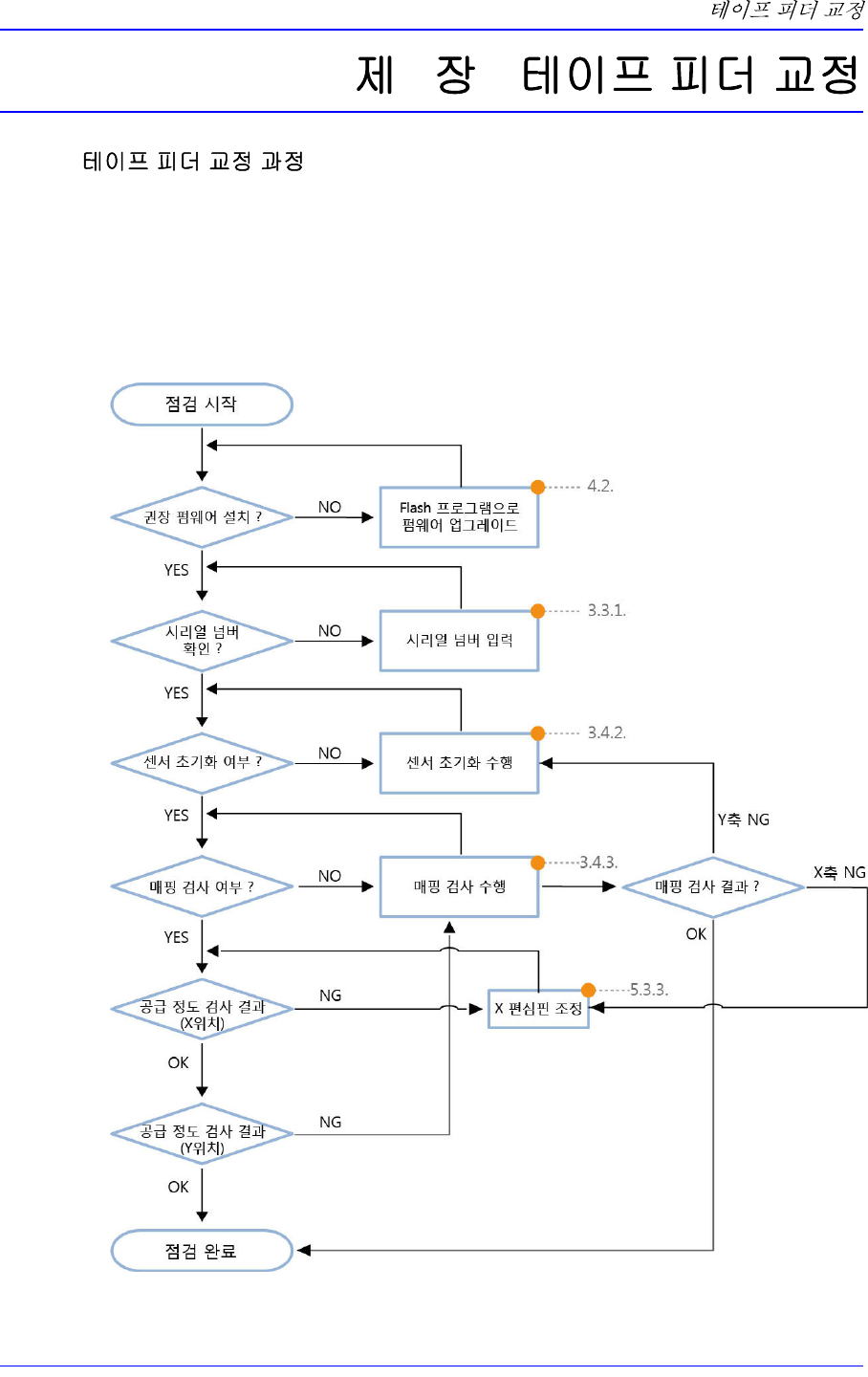 3-1 3 . 3.1. (Flo w Chart) 피더를 정기적으로 교정함으 로써 피더의 부품 공급 정도를 확인할 수 있고 , 피더를 최적의 상태로 유지할 수 있습니다 . 특히 테이프 피더의 메인보드 를 교체했거나 , 인덱스 모터 , 인덱스 기어 , 스프 라켓 부품을 재조립 또는 교체한 경우에는 반드시 해당 피더 를 교정해야 합니다 . 피더의 교정 과정은 다음과 같습니다 .