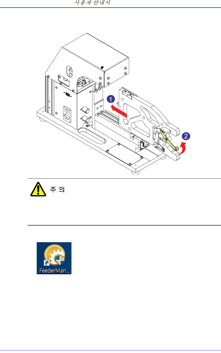 3. 교정 지그의 전방 플레이트에 마스터 피더를 완전 밀착 시킨 후에 클램프 레버