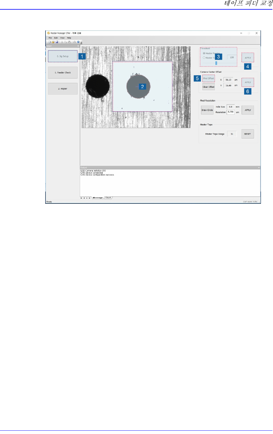 3-5 5. 교정 지그 프로그램 을 실행하고 아래 순서 대로 프로그램을 조작하십시오 . 1) <Jig Setup> 버튼을 클릭하십시오 . 2) 비전 창에서 검사영역을 설정하십시오 . 마우스 왼쪽 버튼을 클릭한 상태로 Drag 하면 영역이 표시됩니다 . 3) 교정 지그 본체의 Co axial, Fiducial 조명을 설정하십시오 . 그리고 프로그램의 <Thresho ld>…