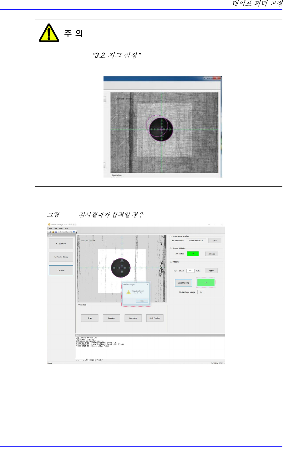 3-24 SME Tape Feeder Calibrat ion Jig 메 모 비전 시스템에서 마스터 테이프의 홀을 인식하지 못할 경우에는 "3.3.3. " 의 Step 5 를 참조하여 Threshold 를 설정하십시오 . 마스터 테이프의 사용 횟수가 초과 (150 회 ) 로 인한 피더의 부품 공급 정도 불량 및 매핑 불량에 대하여 당사에서는 책임지지 않 습니다 . 마스터 테이…