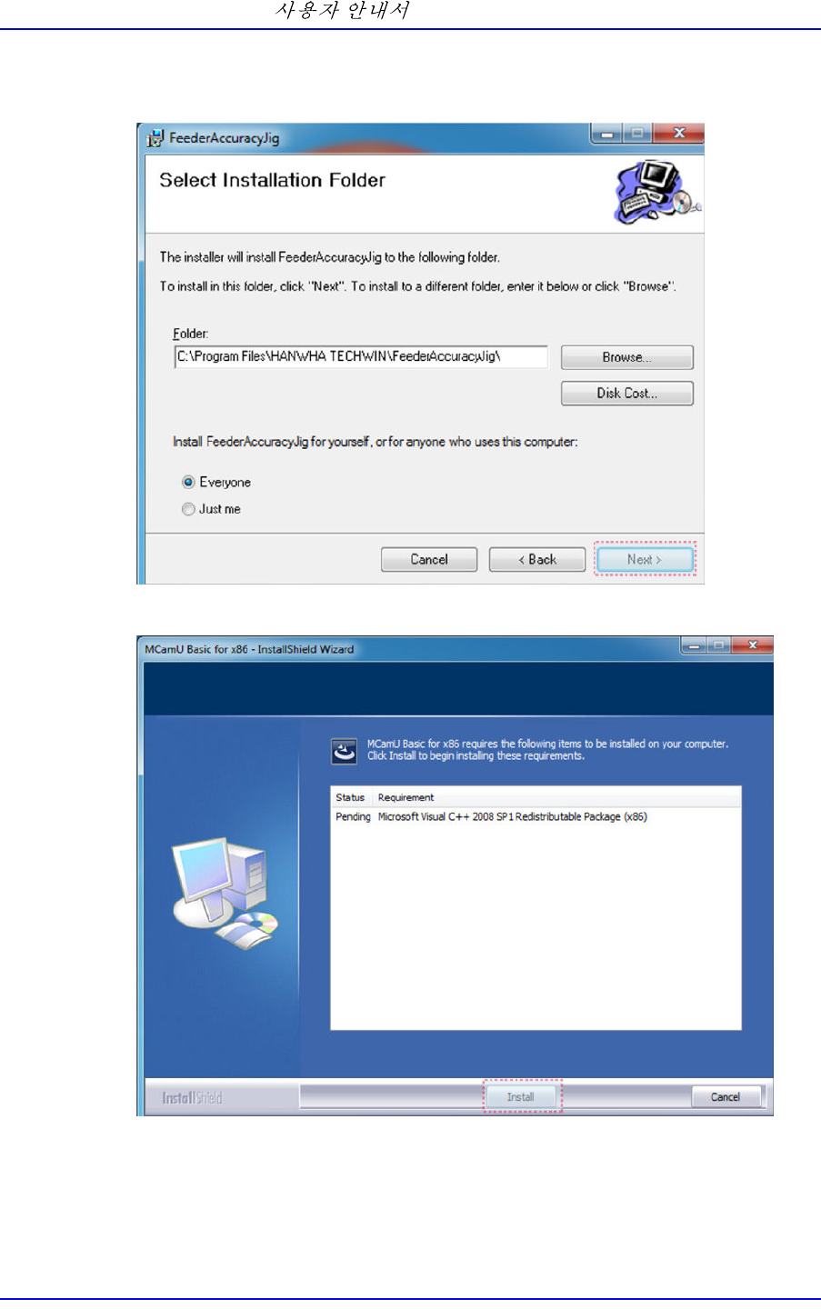 4-2 SME Tape Feeder Calibra tion Jig 2. 아래의 그림과 같이 < Install> 버튼이 나올때 까지 <Next> 버튼을 계속 클릭하십 시오 . 3. <Install> 버튼을 클릭하십시오 .