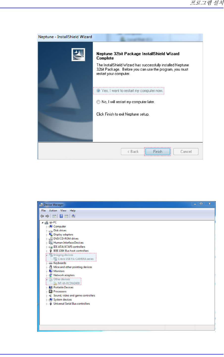 12. 프로그램를 설치 완료하고 PC 를 재부팅한다는 옵션을 선택한 후에, <Finish> 버