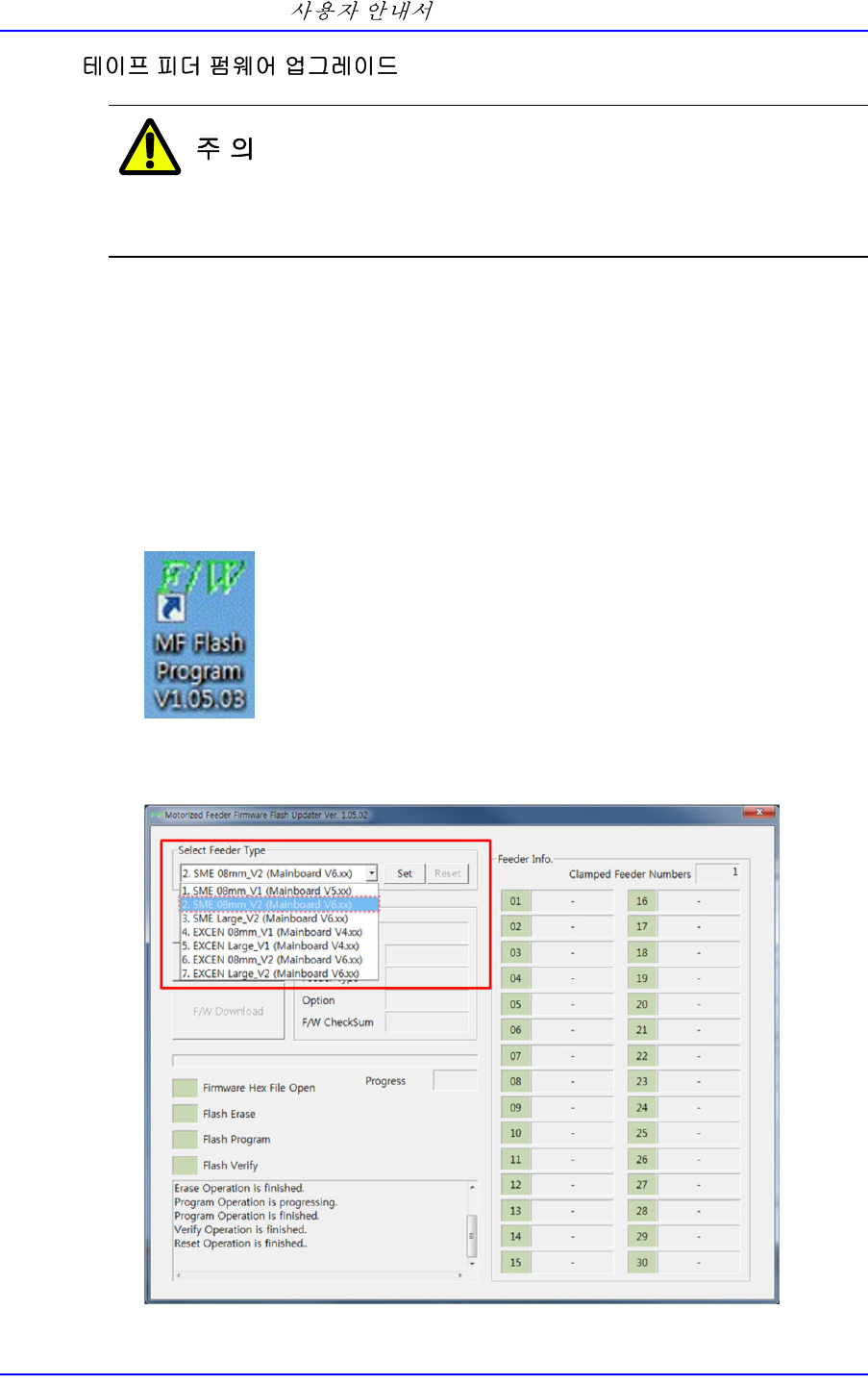2. <Select Feeder Type> 영역의 콤보박스에서 펌웨어 업그레이드할 테이프 피더를