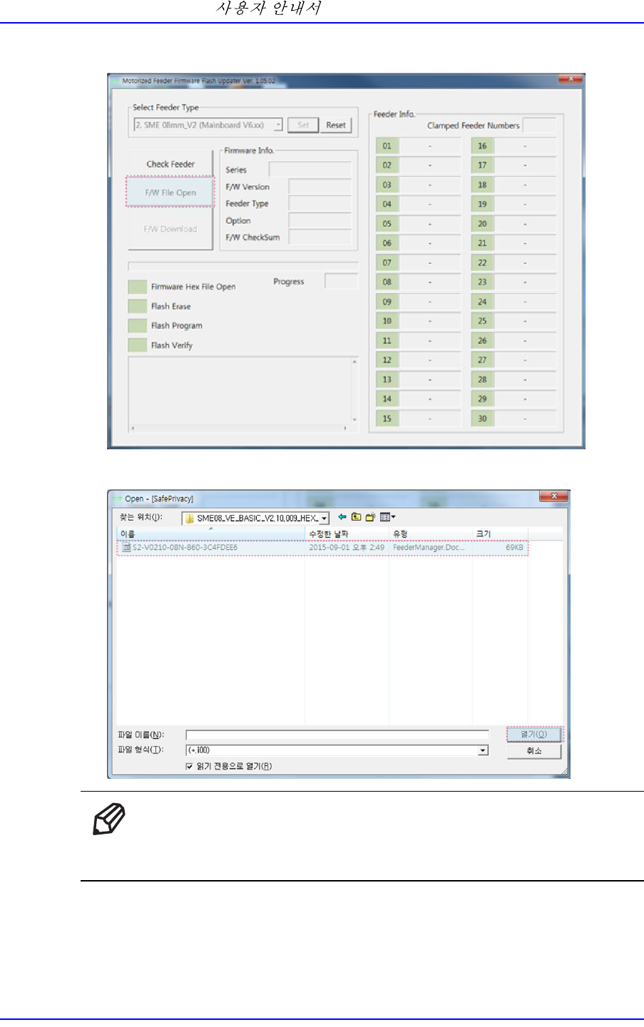 절대로 펌웨어 업그레이드 중에는 테이프 피더의 전원을 차단하