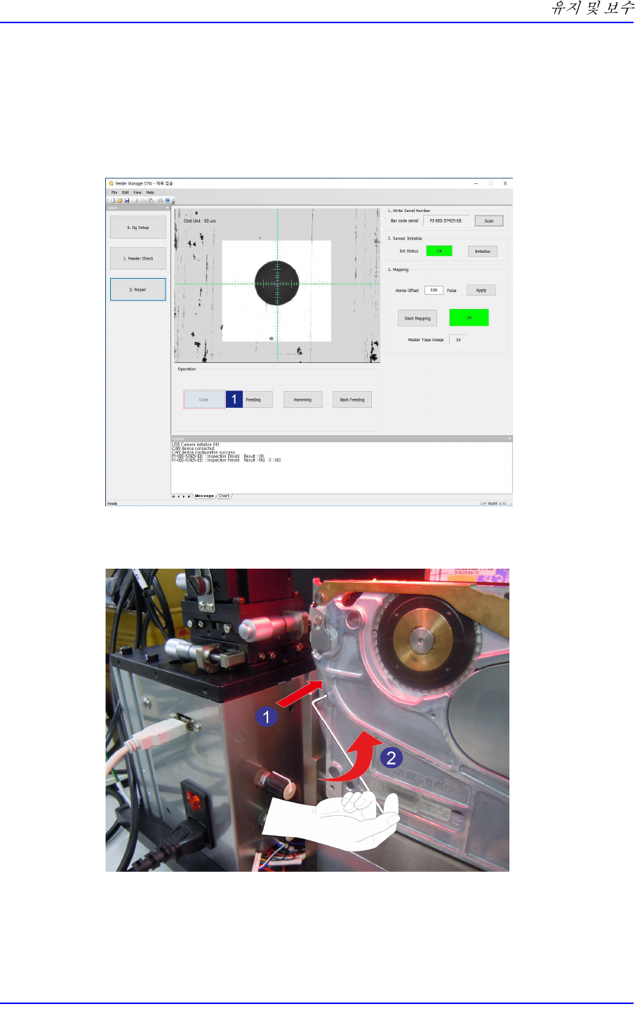 5-6 SME Tape Feeder Calibra tion Jig X 편심핀을 조정할 때에 2.5 mm 렌치에서 길이가 짧은 부분을 육 각 홀에 삽입하십시오 . 2.5mm 렌치를 X 편심핀의 육각 홀에 정확히 삽입하지 않으면 X 편심핀의 육각 홀이 파손 될 수 있습니다 . 4. 비전 창에서 마스터 테이프 홀의 중심과 녹색 십자선의 중심간의 간격이 ±1 셀 이내가 되도록 X 편심핀을 조정하십시…
