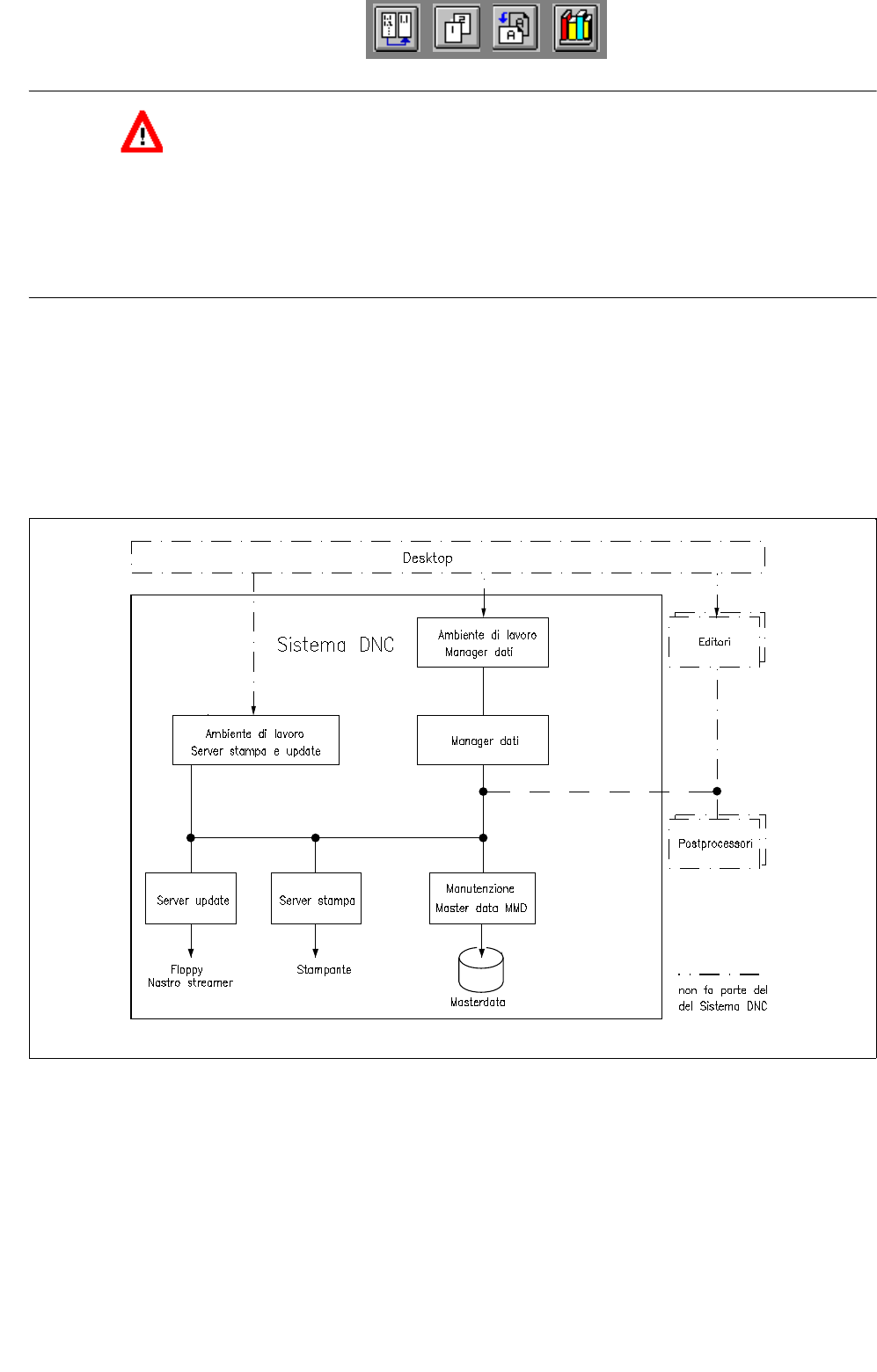 Manuale operatore del calcolatore di linea UNIX 4 Gestione dati Versione software 503.xx Edizione 0 2/2002 4.1 Introduzione 121 I t I I 4.1.2.1 M oduli del sistema DNC - Ambiente di lavoro Manag er dati L'ambiente d…