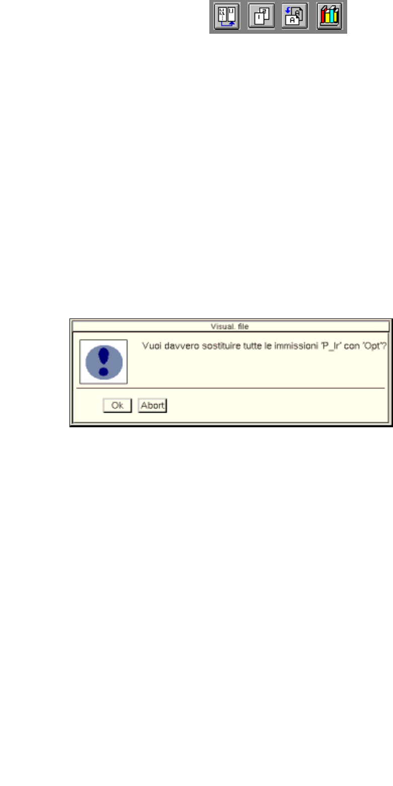 4 Gestione dati Manuale operatore del calcolatore di linea UNIX 4.5 Ambiente di lavoro Visual izzazione file Versione software 503.xx Edizione 02/2002 158 I t I I Modalità di ricerca e sostituzione di su ccessione di seg…