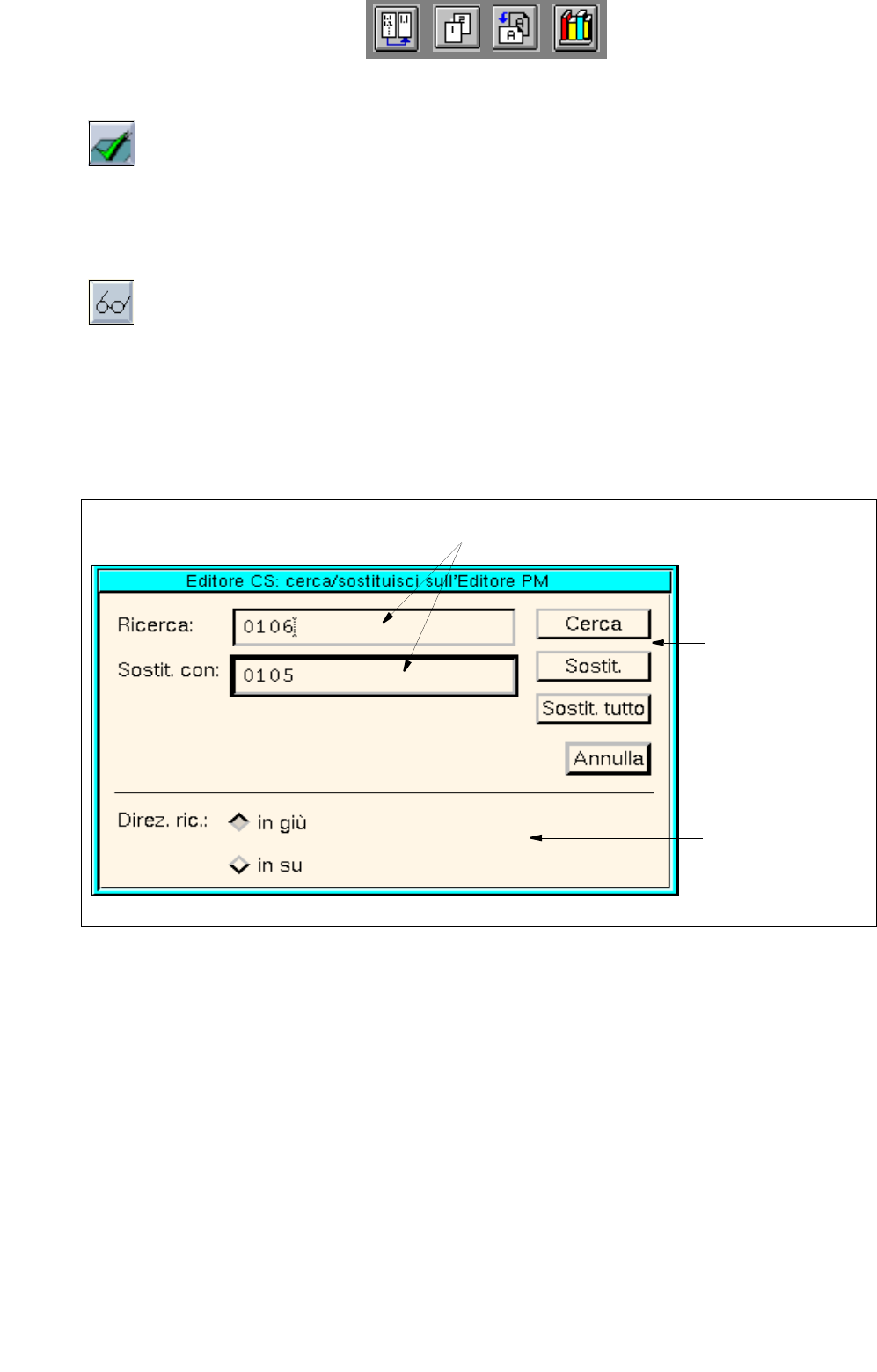 ● Sulla zona editazione "Ricerca" immettere la successione dei segni da cercare.