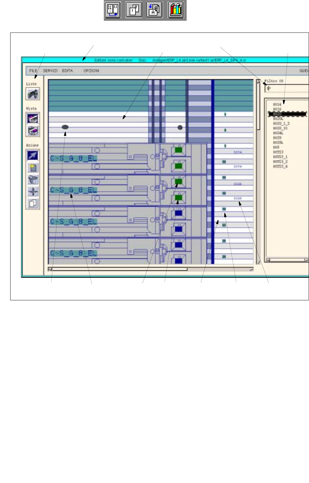La finestra di applicazione dell’Editore zona caricatori è articolata nelle seguenti zone:
