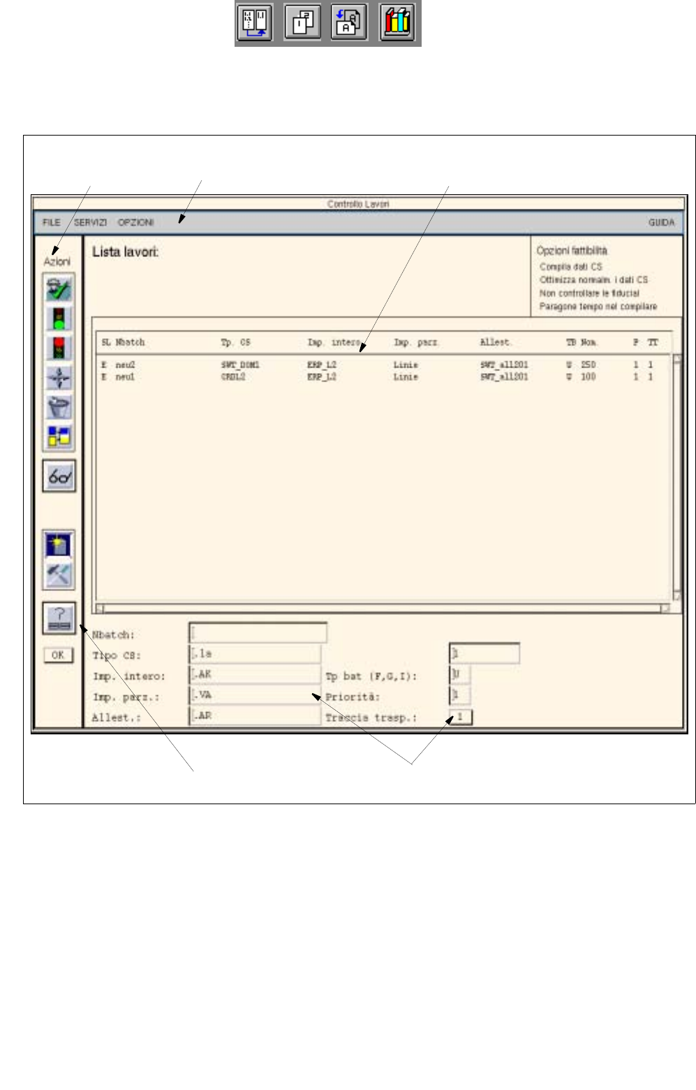 - La sezione superiore (zona comandi “Azioni“) comprende i comandi con i quali i lavori selezionati ven-