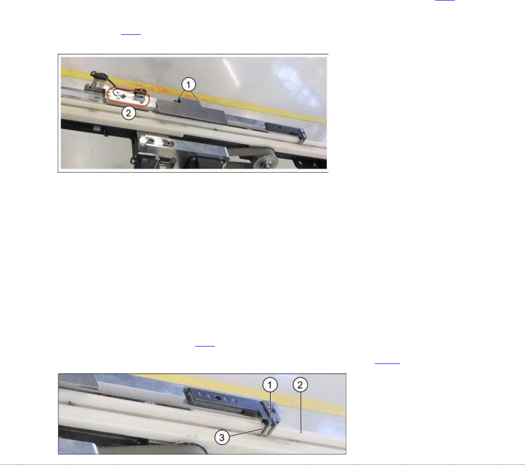 ➢ Stellen Sie ca. 0,5 mm Abstand (3) vom Mitnehmer (1) zur weißen Kunststoffführung (2) ein.