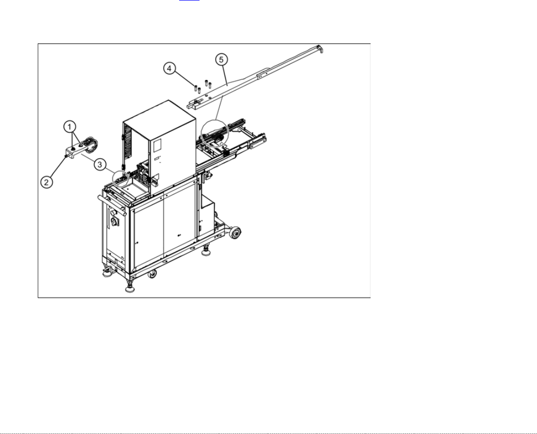 ➢ Lösen Sie die vier Befestigungsschrauben (2) der Mit- nehmer-Einheit. Die beiden Enden