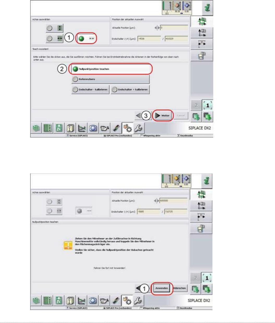 Interne Serviceanleitun g WPC5 / WPC6 Seite 4-135 4.3.1 Nullpunktposition teachen ➢ W ä hlen Sie die Ladeachs e aus (1). ➢ W ä hlen Sie die Funkt ion Nullpunktposition teachen aus (2). ➢ W ä hlen Sie Weiter (3). ➢ Befo…