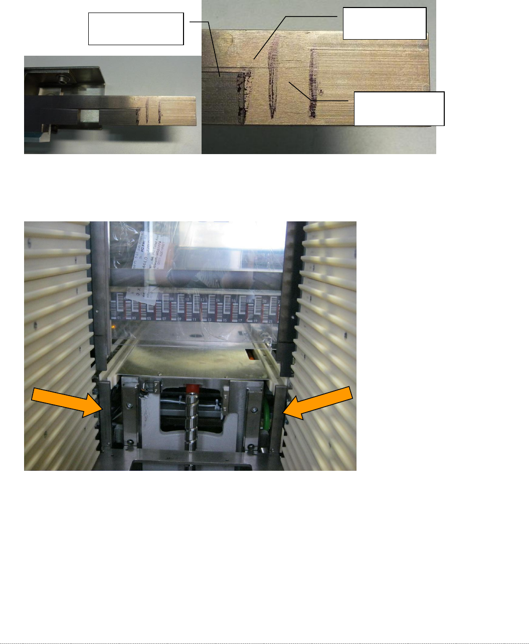 Interne Serviceanleitun g WPC5 / WPC6 Seite 5-152 5.5 Einstellen der Po sitionen der Führungsleisten Bringen Sie an allen Fü hrungsleisten des Turm s Hilfsmark ierungen an, wie unten darges tellt. Abbildung 9: Markieru…
