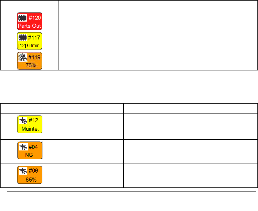 第 4 章 操作篇 4- 3. 生产 38 供给部相关的错误,警 告 供给部发生错误 ,警告时,将 显示以下图标。 显示 状态 说明 无元件 错误 显示发生无元件 的供给位置编 号。 无元件 警告 显示预测可能发 生无元件的供 给位置编号和剩余 的基板预定块数 ,预定时间。 吸取率降低警告 显示低于各元件 所设定吸取率 的带式供料器供给 位置编号和实际 吸取率。 贴片头 , 吸嘴相关的错误 , 警告 贴片头,吸嘴发 生错误,警告…
