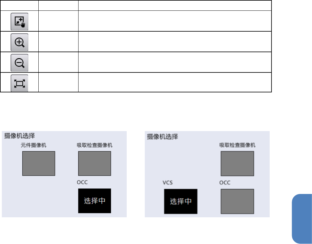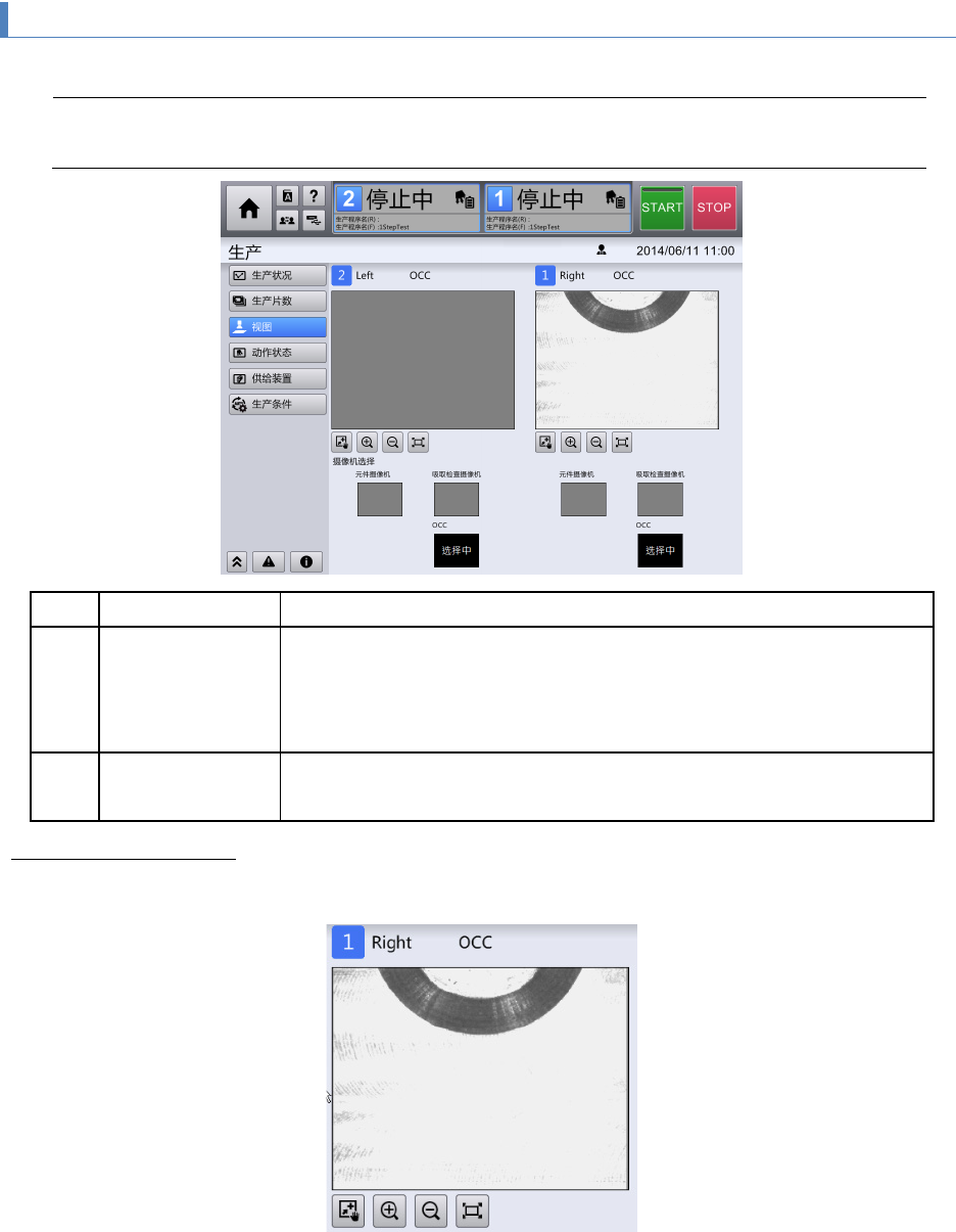 第 4 章 操作篇 4- 3. 生产 40 4-3- 5. 视图 触摸 [ 生产 ] 画面子菜单 面板中的 [ 视图 ] ,可显示 [ 视图 ] 画面。 注意 • 如 果在 [ 视图 ] 画面状态 下生产,需时会降低 。 记号 名称 说明 (a) 选中 摄像机的显 示,操作 放大显示摄像机 选择区域 (b) 中选择的摄像机 图像。 单元 2 的摄像机信息显示于左 侧, 单元 1 的摄像 机信息显示于右侧。 此外,针对选中 摄像机的图像 …