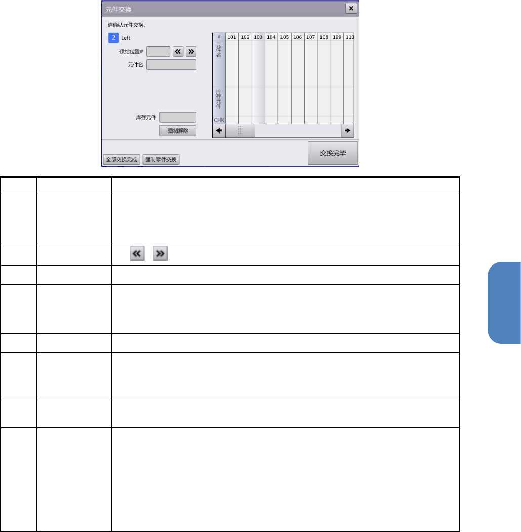 第 4 章 操作篇 4- 4. 元件交换 50 将只检查带式供 料器是否正确 安在更换对象的供给 部中。 1 选择发生无元件的元件时,可一边确认元件交换列表,一边触摸 / ,结合发生无 元件的供给位置确认元件名,然后更换元件。 触摸 元件交换列 表中显示的供给位 置,可选择供给位置 。 针对发生 无元件的供 给位置,可触摸列表 的 [ 库存元件 ] ,更改 库存元件。 2 触摸 [ 交换完毕 ] 。 此时,如果有带 式供料器没有 正确安…