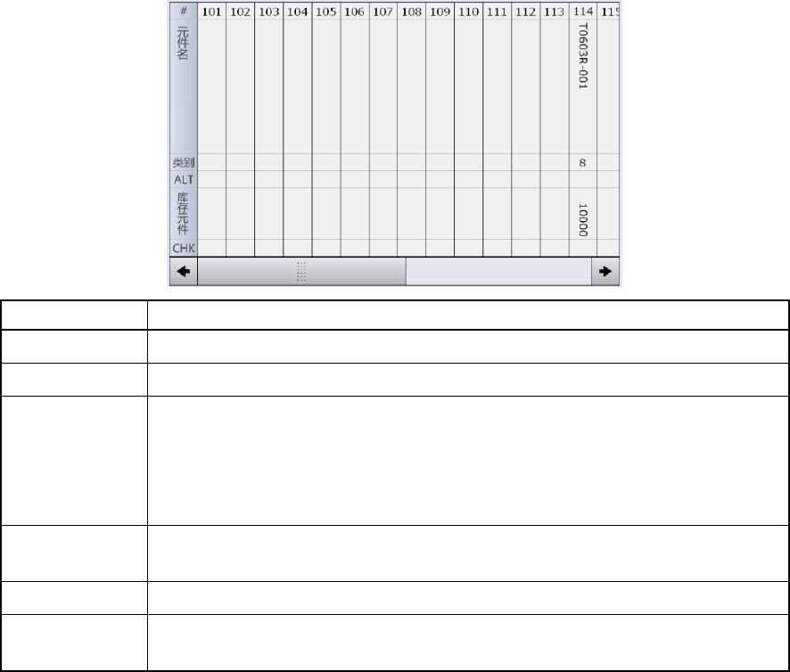 第 4 章 操作篇 4- 5. 安排 60 供给部 列表 显示 说明 # 显示供给位置编 号。 元件 名 显示生产时所用 元件的元件名 。 类别 显示所用带式供 料器的种类。 • 8 : 8m m • 12 : 12mm ALT 关于 元件供给位置备用目标的 供给位置,显 示元件供给位置备用 源的供给位置 编号。 库存 元件 显示每个供给部 的库存元件。 CHK 触摸 [ 元件 核对 ] 后显示 [ 元件 核对 ] 对话框,以 OK…