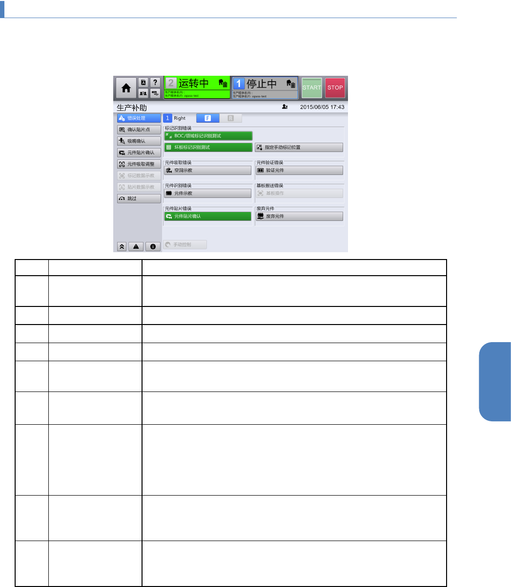 触摸[生产补助]画面子菜单面板中的[错误处理],显示[错误处理]画面。