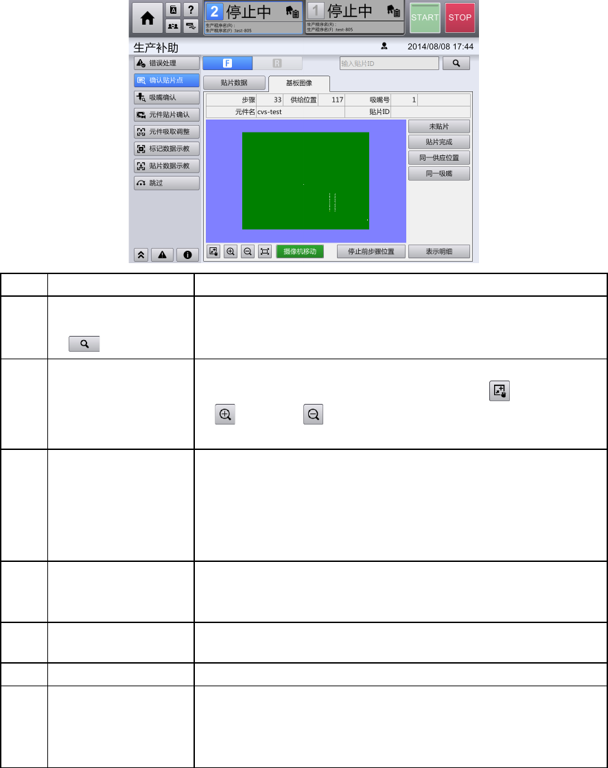 第 4 章 操作篇 4- 6. 生产补助 69 4 [ 摄像机操作 ] 对话框 触摸 [ 贴片 点 确认 ] 画面 中的 [ 摄像机 移动 ] ,显示 [ 摄像机 操作 ] 对话框。 关于操作按钮的 详情,请参阅 「 4-3- 4. 视图」的「 显示 生产 中的摄像机图像」。 照明按钮中,可 触摸 / 更改照明的亮度。 [ 贴片数据 /元件 资料明细 ] 对话框 触摸 [ 贴片 点 确认 ] 画面 中的 [ 表示明细 ] ,显 …
