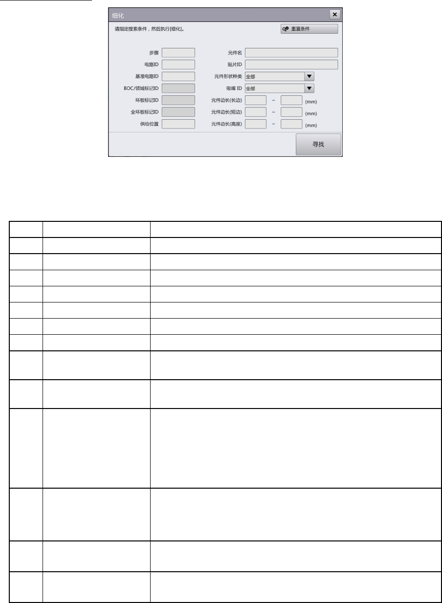 第 4 章 操作篇 4- 6. 生产补助 83 4 记号 名称 说明 (n) 元件 边长 ( 高度 ) 指定要 搜索 的步骤信息中元件 的高度尺寸范 围。还可只 搜索 最小 值或最大值。 (o) 重置条件 重置所有的细化 条件后显示。 (p) 寻找 根据各 细化 条件中指定的内容 细化数据,列 表显示调出源的画 面。