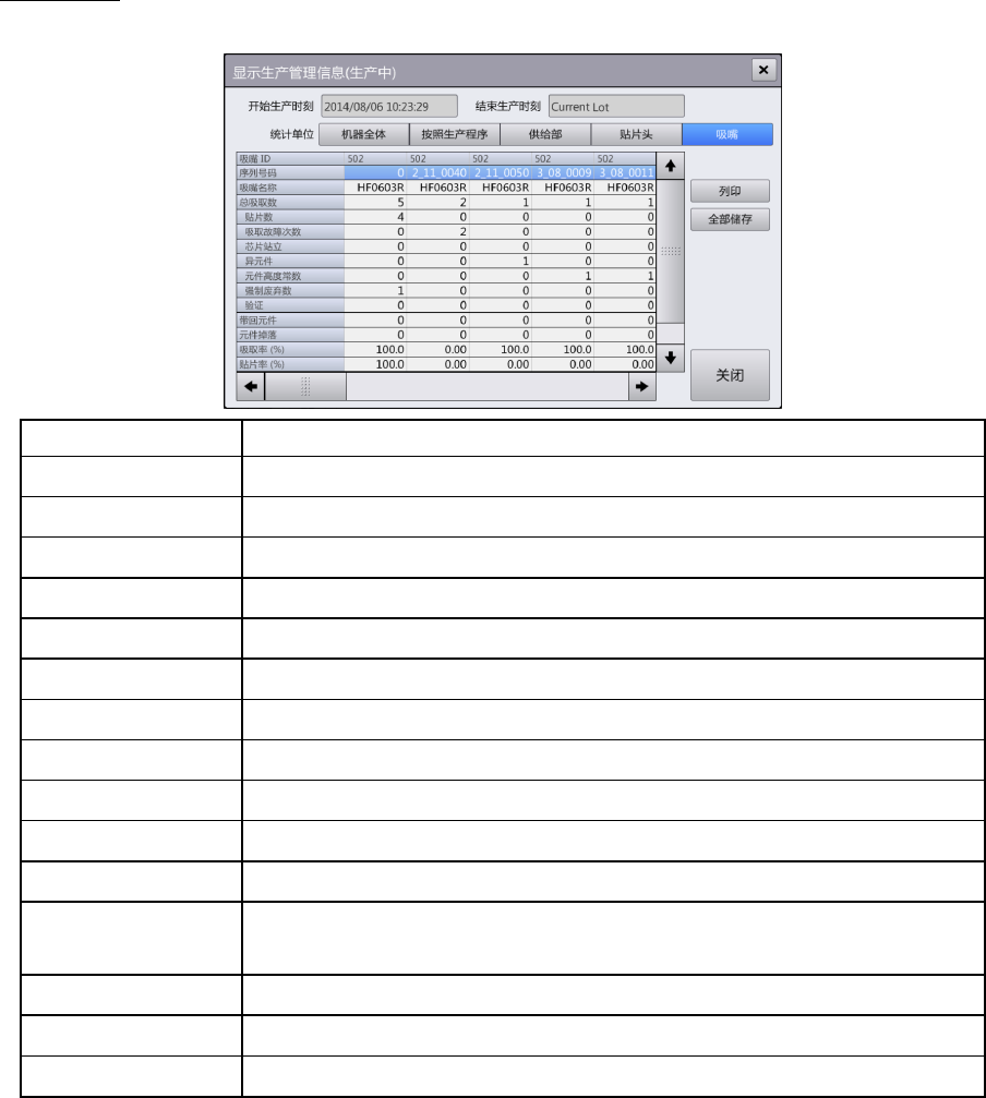 按不同序列号的吸嘴列表显示统计的生产管理信息的详细数据。
