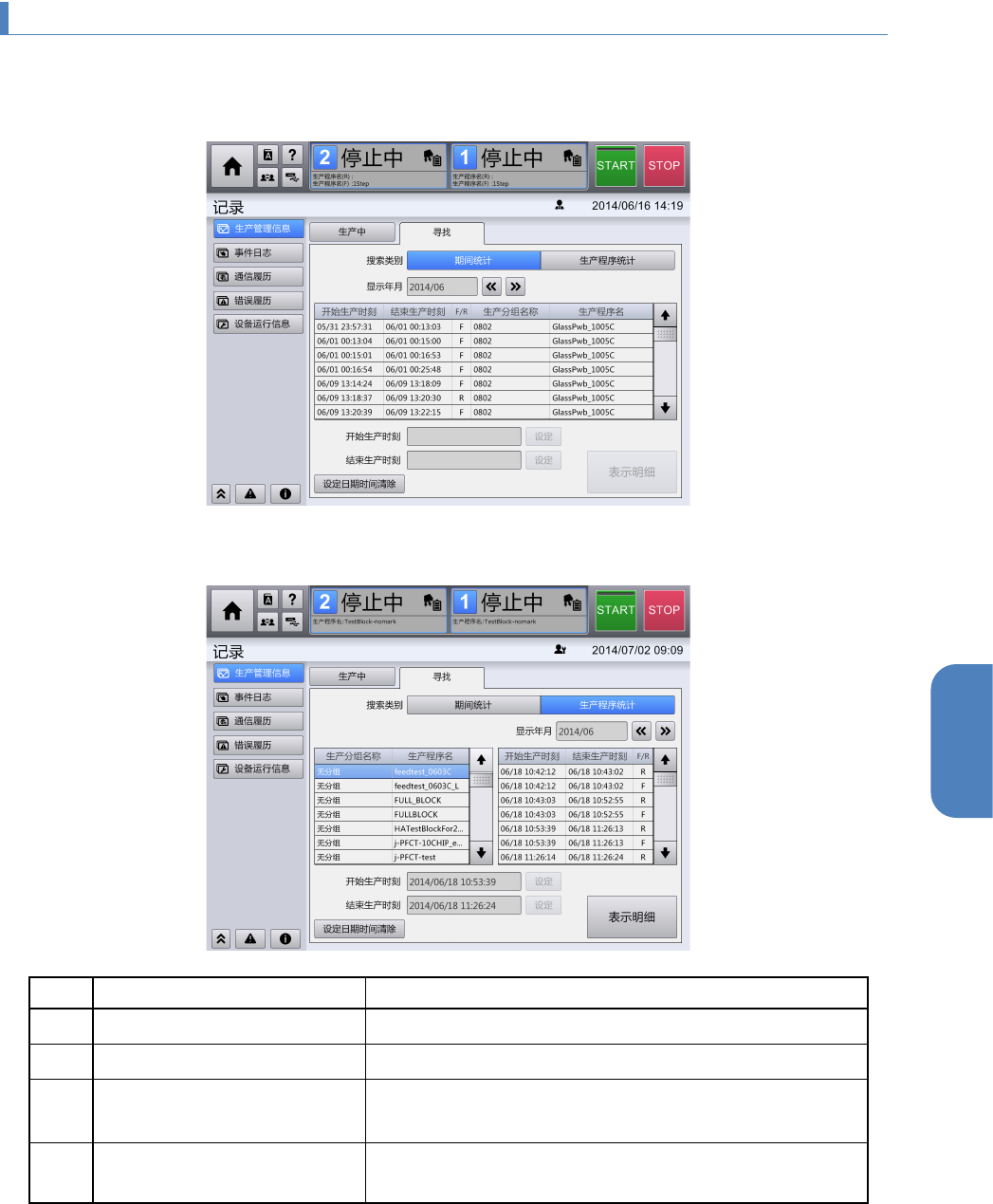 第 4 章 操作篇 4- 8. 记录 125 4 4-8- 2. 以前的 生产 程序的生产管 理信息 在 [ 记录 ] 菜单中 按 [ 生产管理信息 ] - [ 寻找 ] 的顺序触摸后显示。 选择 [ 寻找 ]-[ 期间统计 ] 选择 [ 寻找 ]-[ 生产 程序 统计 ] 记号 名称 说明 (a) 搜索 类别 选择 [ 期间统计 ] 或 [ 生产 程序 统计 ] 中任意一个。 (b) 显示年月 显示生产管理信 息的年月,还 可…
